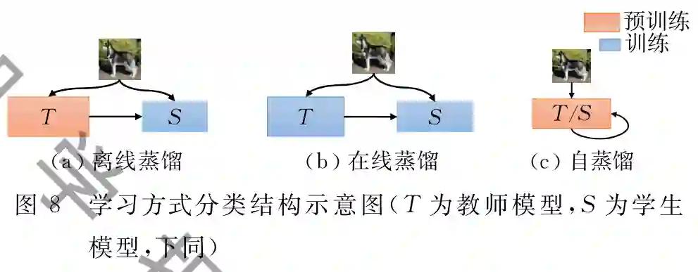 类似于人类教师和学生间的学习模式,神经网 络的知识蒸馏学习方式也有着多种模式.其中,学生 模型基于预训练好的、参数固定的教师模型进行蒸 馏学习被称为离线蒸馏.相应 地,教师和学生模型同时参与训练和参数更新的模 式则称为在线蒸馏.如果学生 模型不依赖于外在模型而是利用自身信息进行蒸馏 学习,则被称为自蒸馏学习,如图7 所示.一般而言,蒸馏框架都是由一个教师模型和一 个学生模型组成,而有多个模型参与的蒸馏称为多模型蒸馏;目前,大部分 蒸馏框架都是默认源训练数据集可用的,但最近的 很多研究在不使用任何已知数据集的情况下实现 蒸馏,这类统称为零样本蒸馏(又称为无数据蒸馏,).特别地,出于一些 隐私保护等目的,教师模型可以享有一些特权信息而 学生模型无法访问,在这种约束下,形成特权蒸馏 学习.接下来,将分别介绍不同蒸馏学习方式的代表性工作.