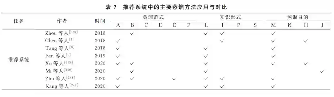 近些年,推荐系统(RecommenderSystems,RS) 被广泛应用于电商、短视频、音乐等系统中,对各个 行业的发展起到了很大的促进作用.推荐系统通 过分析用户的行为,从而得出用户的偏好,为用户 推荐个性化的服务.因此,推荐系统在相关行业中 具有很高的商业价值.深度学习应用于推荐系统 同样面临着模型复杂度和效率的问题.但是,目前 关于推荐系统和知识蒸馏的工作还相对较少.本文 在表7中整理了目前收集到的相关文献,可供研究 人员参考.