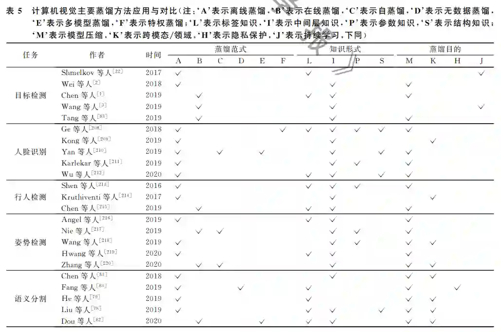 计算机视觉一直是人工智能的研究热点领域之 一.近年来,知识蒸馏被广泛应用于各种视觉任务达 到模型压缩、迁移学习和隐私保护等目标.虽然知识 蒸馏的应用十分广泛,但是由于各个研究方向的热 度不同,所以相关研究的论文数量也会有很大的差异.本文重点引用了知识蒸馏在视觉上的热点方向, 并列举相关论文的方法供读者查阅学习,而对于其 他一些方向可能存在取舍.目前,应用知识蒸馏的视 觉研究主要集中在视觉检测和视觉分类上.视觉检 测主要有目标检测、人脸识别、行人检测、姿势检测;而视觉分类的研究热点主要是语义分割,如表5所 示.另外,视觉中还有一些其他应用比如视频分 类[105]、深度估计和光流/场景流估计[169]等等.
