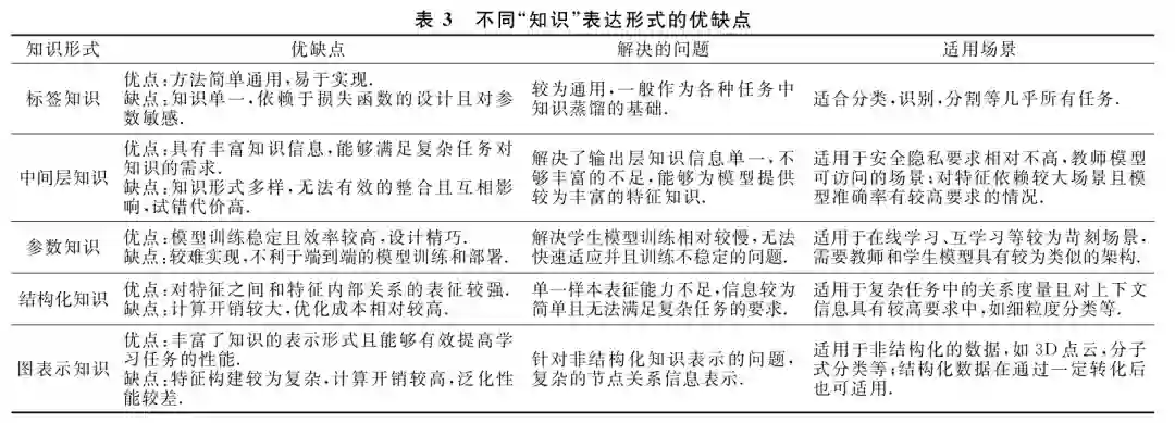 知识蒸馏方法的核心在于“知识”的设计、提取和 迁移方式的选择,通常不同类型的知识来源于网络模 型不同组件或位置的输出.根据知识在教师学生模型 之间传递的形式可以将其归类为标签知识、中间层知 识、参数知识、结构化知识和图表示知识.标签知识一 般指在模型最后输出的logits概率分布中的软化目标 信息;中间层知识一般是在网络中间层输出的特征图 中表达的高层次信息;参数知识是训练好的教师模型 中存储的参数信息;结构化知识通常是考虑多个样本 之间或单个样本上下文的相互关系;图表示知识一般 是将特征向量映射至图结构来表示其中的关系,以满 足非结构化数据表示的学习需求.本节主要对蒸馏知 识的5类传递形式加以介绍,理清主流的知识蒸馏基础 方法,后面介绍的各类蒸馏方法或具体应用都是以此 为基础.相关的优缺点和实验对比,见表2~表4所示.
