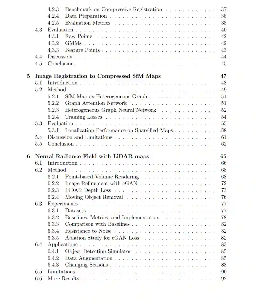 我们探讨了大规模和长期神经地图表示的问题。地图为现代机器人应用提供了宝贵的信息,例如自动驾驶和 AR/VR。在这篇论文中,我们探索了地图设计的两个重要角度:大小和丰富度。首先,我们研究了图像至激光雷达地图、激光雷达至激光雷达地图,以及图像至SfM地图注册的地图压缩问题。对于图像至激光雷达地图注册,我们提出了一种基于学习的技术,来在进行图像注册前预计算并压缩体素化的激光雷达地图。对于激光雷达至激光雷达地图注册,我们对现有基于深度学习和传统方法进行了地图压缩基准测试。对于图像至SfM地图注册,我们提出通过异构图神经网络从SfM地图中选择重要关键点。这三项工作的结果都显著减小了地图的大小,通过离线预处理减轻了在线图像注册的数据负担。其次,受到最近NeRF工作的有希望结果的启发,我们开发了一套激光雷达辅助的NeRF系统,该系统将户外环境的丰富外观和几何细节编码到基于点的神经表示中,并进行新颖的视图合成。与大多数之前主要集中在室内或小场景的NeRF工作不同,我们的系统是为更具挑战性的规范自动驾驶数据集(如Argoverse 2)而设计的,该数据集的训练视图更为稀疏,场景复杂性更大。我们使用了一个带有条件GAN的基于点的NeRF框架,并成功超越了最先进的户外NeRF基准。此外,我们还探索了户外NeRF的几个应用,包括数据增强、对象检测和季节性视图合成。我们的实验显示了在未来将神经表示应用于更实用的户外应用的可预见潜力。
