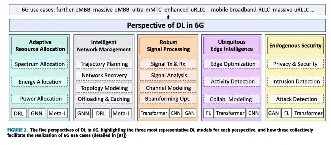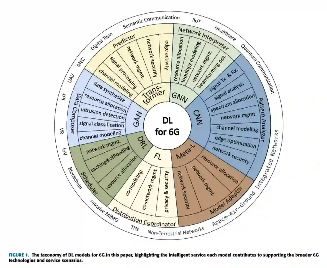 深度学习在预测、决策和回归分析方面展现出的卓越能力,不仅在自然语言处理和计算机视觉领域证明了其有效性,而且还越来越多地影响着未来通信的智能化(Jiao et al., 2006; Letaief et al., 2019)。在6G技术的发展中,深度学习将关键地解决多个挑战。为了满足6G愿景(Wang et al. 2023),**图神经网络(GNNs)**能够迅速建模网络,有助于在6G网络中实现全球覆盖和数字集成(Suarez et al., 2019; Shen et al., 2023)。**元学习(Meta Learning)**使深度学习模型适应新任务,从而支持实现全感知和全频谱(Jung et a l., 2021)。**深度强化学习(DRL)**在高效管理网络资源和数据方面发挥着关键作用,为全面应用的时代铺平了道路(Luong et al., 2019; Hortelano et al., 2023; Chen et al., 2021)。**联邦学习(FL)**通过其分布式学习过程,确保在保持全球覆盖的同时强化安全性(Nguyen et al., 2022)。生成对抗网络(GANs)的数据分布学习能力,对于增强强安全性具有巨大潜力(Dunmore et al., 2023)。此外,卷积神经网络(CNNs)的模式识别能力和Transformer的序列特征提取能力为6G网络中推进全面应用和加强安全性奠定了基础(Wang et al., 2023; Mohammadpour et al., 2022)。以及Transformer作为新的基础模型在编解码过程中和生成式AI中担任着重要作用。这些深度学习方法不仅在迅速过渡到6G时代的无线通信中起到了重要作用,而且它们相互补充和支持,为构建更智能、更紧密的6G网络做出了贡献(Shen et al., 2022)。