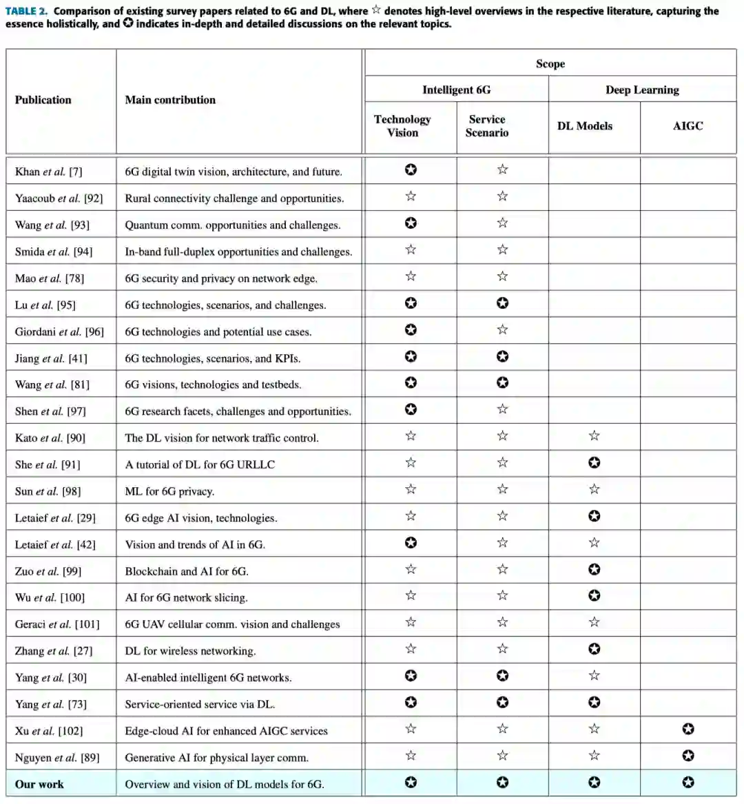 本文突出深度学习在融入6G时的机遇与挑战,虽然存在许多关于DL和6G的相关综述,如表2所示,本文通过全面整合各种DL技术到6G,并提供深入见解,从而使其区别于其他文献。并且不同于其他专注于特定6G情景或技术的工作,我们优先考虑这些模型如何优化和增强6G技术。