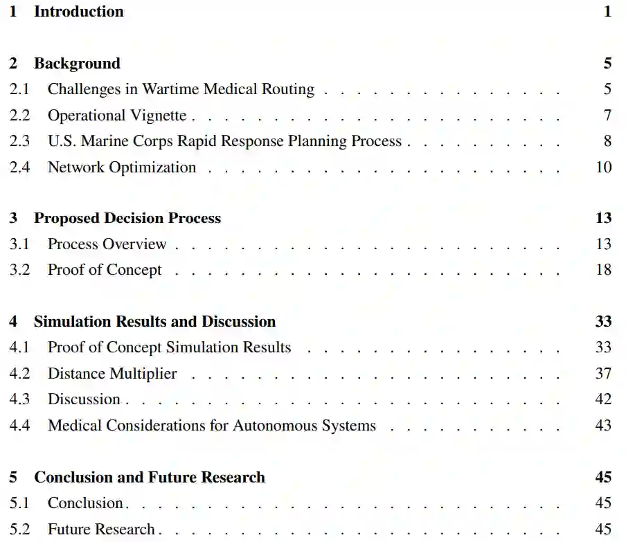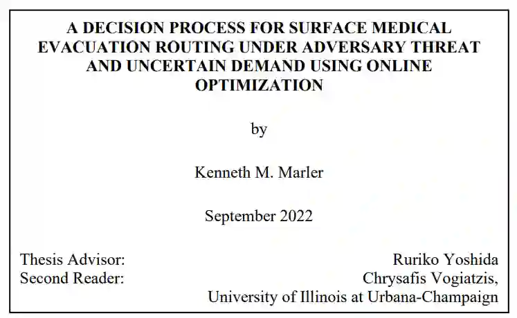 新出现的威胁将美国海军的作战概念集中在濒海和海洋区域的敏捷、分布式战术部队上。鉴于威胁的性质及其所处位置,通过空中进行医疗后送可能会因条件恶劣或距离遥远而不可行,这就需要转向水面或水下战略。在战争中,医疗需求和对手的行动都是不可预测的,因此需要一个考虑到不确定性的路由决策过程。利用美国海军陆战队快速反应规划流程和在线优化的原理,我们提出了一种在需求不确定的情况下针对对手的水面医疗后送路由决策流程,该流程可应用于有人和自主运输行动。我们通过开发一种通过网络进行医疗转运的路由算法,展示了决策过程的可计算性,然后将该算法作为 Python 中的一个仿真模型加以实现。我们将模型的基本情况与完美信息条件下的两个修正情况进行比较,以讨论使用不恰当假设建模的风险。然后,利用仿真模型的多次运行,提出了一个开发距离乘数的过程,以估计对手存在对现有仿真模型的影响,而无需完全重新设计。