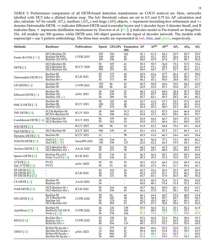 Deformable-DETR UP-DETR Efficient-DETR SMCA-DETR TSP-DETR Conditional-DETR WB-DETRP nP-DETR Dynamic-DETR YOLOS-DETR Anchor-DETR Sparse-DETRD 2ETRFP-DETR DAB-DETR CF-DETR DN-DETR AdaMixer REGO-DETR DINO