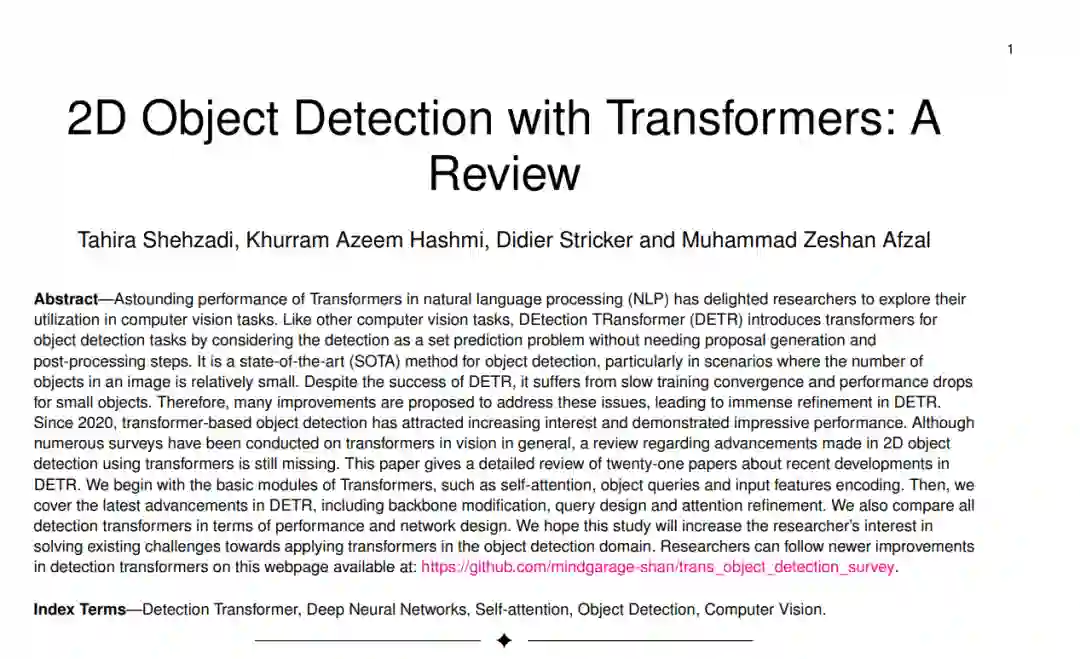 ransformers在自然语言处理(NLP)中的卓越性能激发了研究者们探索其在计算机视觉任务中的应用。像其他计算机视觉任务一样,DEtection TRansformer(DETR)通过将检测视为一种集合预测问题,而无需生成建议和进行后处理步骤,将transformers引入到目标检测任务中。它是一种用于目标检测的最先进(SOTA)方法,特别是在图像中的目标数量相对较少的情况下。尽管DETR取得了成功,但它在训练收敛速度上存在问题,并且在小目标上的性能有所下降。因此,提出了许多改进方案来解决这些问题,从而对DETR进行了大量的改进。自2020年以来,基于transformer的目标检测引起了越来越多的关注,并展示了令人印象深刻的性能。尽管已经进行了大量关于视觉领域中transformers的调查,但是关于使用transformers进行2D目标检测的改进的回顾仍然缺失。本文详细回顾了关于DETR最近发展的二十一篇论文。我们从Transformers的基本模块开始,例如自注意力、目标查询和输入特性编码。然后,我们覆盖了DETR的最新进展,包括骨干修改、查询设计和注意力精炼。我们还在性能和网络设计方面比较了所有的检测transformers。我们希望这项研究将增加研究者对解决将transformers应用于目标检测领域的现有挑战的兴趣。研究人员可以在此网页上跟踪检测transformers的新进展:https://github.com/mindgarage-shan/trans_object_detection_survey。