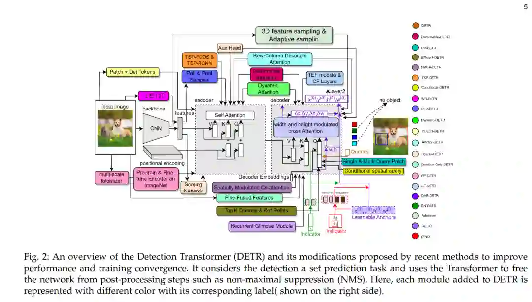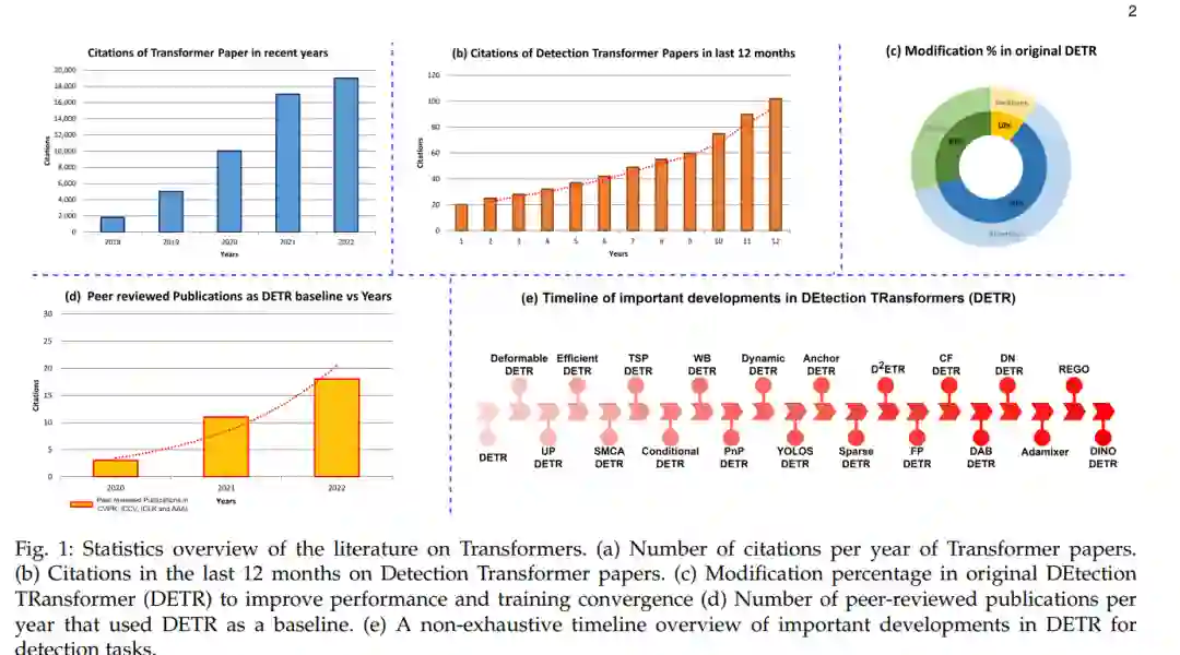 本文提供了2D检测Transformers最近进展的详细概述。表1显示了改进检测Transformer(DETR)以提高性能和训练收敛的修改概述。我们的贡献