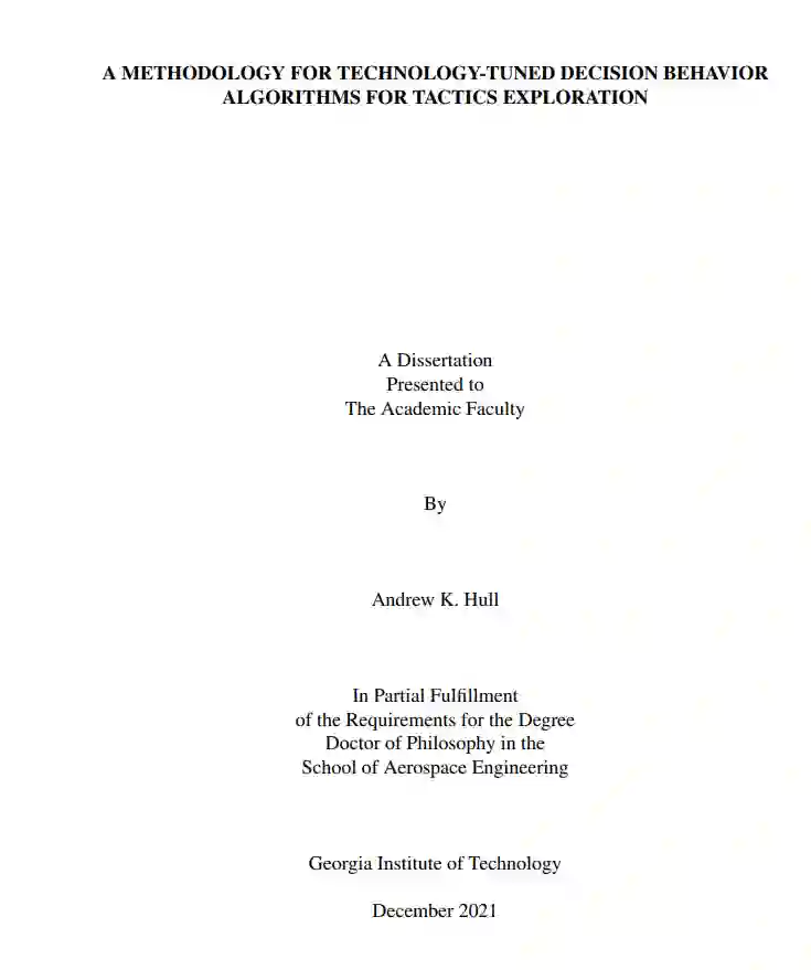 本论文分为五个研究领域,以解决技术评估方法在战术量化方面的不足。首先研究确定一个合适的智能体建模框架。然后可以解决智能体行为框架的开发问题。一旦制定了智能体的建模和行为框架,将讨论进行任务行动设计空间探索的方法。然后将讨论该方法对合作多智能体系统的可扩展性。最后一个研究领域的重点是对结果进行调节,以便对不同的技术-战术组合进行比较。