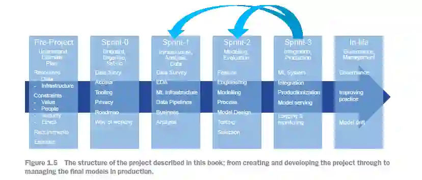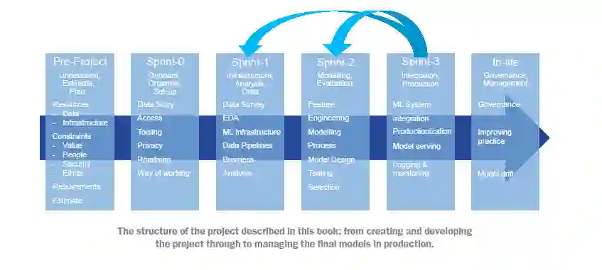 本书的组织方式:路线图。在每一章中,除了本章,内容都以结构化的方式呈现,目标是实现准确性和简洁性。 * 第一章提供了我在写这本书时脑海中的核心概念和动机的描述,希望能让读者了解这本书试图传达什么,以及它如何帮助。 * 第二章概述了在客户、自己和组织之间建立项目共识的步骤,无论该组织是客户的另一个部门还是独立的。你将学习如何组织过程,与客户合作建立需求,深入了解客户的数据,并确定必要的工具。 * 第三章介绍了如何创建一个你的团队和利益相关者可以理解的项目假设,这包括创建可以让项目得到适当资金和资源的估算,以及为了让项目正式启动并运行需要完成的工作。你将学习开始项目需要理解什么,谁需要理解它,谁需要同意。 * 第四章介绍了进行冲刺0所需的工作。这个冲刺包含了开始项目的工作,并使团队进入项目。在第四章,你将了解启动一个ML项目和让团队开始工作并提高效率所需的条件。 * 第五章涵盖了冲刺1的第一部分。这项工作要求有一个技术团队,并能够访问推动进展所需的系统和信息。在这一章,重点是获取团队需要用来创建机器学习模型的数据,并将其放入可以用来支持建模的环境中。 * 第六章利用数据管道完成了冲刺1的工作,以理解客户的数据并构建第一个原型模型。你将学习需要进行哪些类型的数据探索,以及团队成功开始建模所需的步骤。 * 第七章开始冲刺2的工作,重点在于使用结构化和系统性的过程建立有用的模型,以及确定将进行详细评估并选择集成到生产系统中的模型。在第七章,你将了解建模团队应采取哪种结构和流程。 * 第八章完成了冲刺2,提供了在线和离线环境中的模型进行结构化测试和选择的指导,包括讨论评估模型时常遇到的陷阱和问题。你将学习在评估和比较ML模型时需要注意什么,以及如何管理这些比较的过程。 * 第九章深入介绍了冲刺3的实施,详细描述了将选定的模型集成到生产系统并部署使用的过程。它还强调了为提供用户友好界面必须考虑的重要因素。在这里,你将学习将模型从有趣的实验转变为组织运行系统的一部分需要什么。最后,在第十章中,描述了管理生产中的机器学习系统的含义和必要的实践。第十章的目标是展示为了将ML项目维持为价值引擎,需要建立和运行哪种类型的流程和结构。