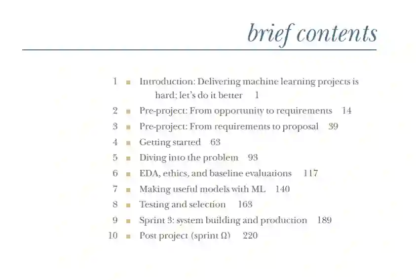 这本书旨在提供一个逐步的实施机器学习项目的指导手册。它是建立在自20世纪90年代以来涌现的大量工作的基础上,解决了机器学习开发者面临的挑战。本书中记录的方法并非原创,尽管有些是未发表的,因为我试图将最佳实践和学术出版物编码化。我尽可能提供参考文献,但我肯定有遗漏的地方。无论如何,如果没有引用,请理解我没有声称发明或创新——只是我找不到署名,如果我冒犯了你,我表示道歉。有很多关于AI和ML的技术书籍,所以这本书并不试图填补那个空白。如果你对这些话题了解不深,那么在试图应用这种方法论之前,以下的书籍是好的起点: