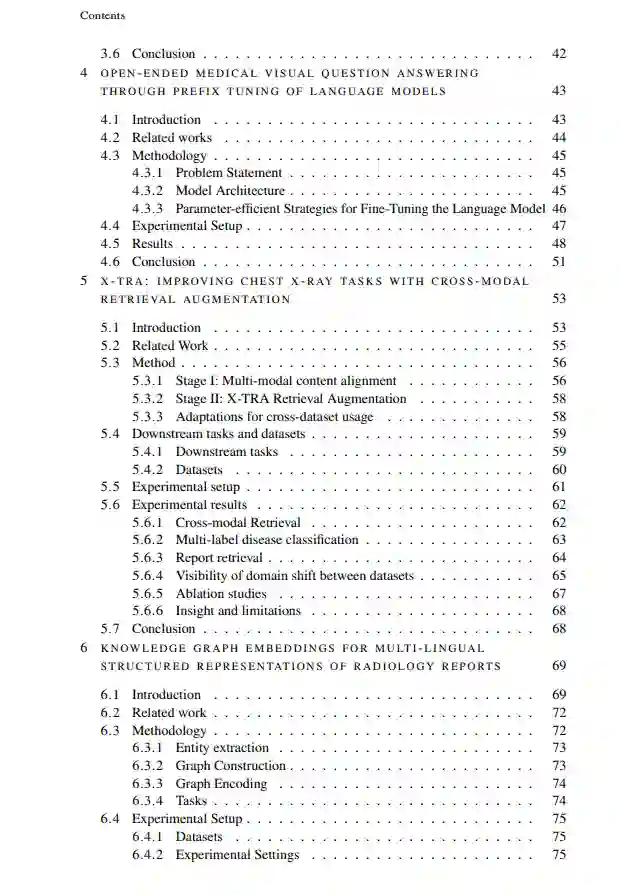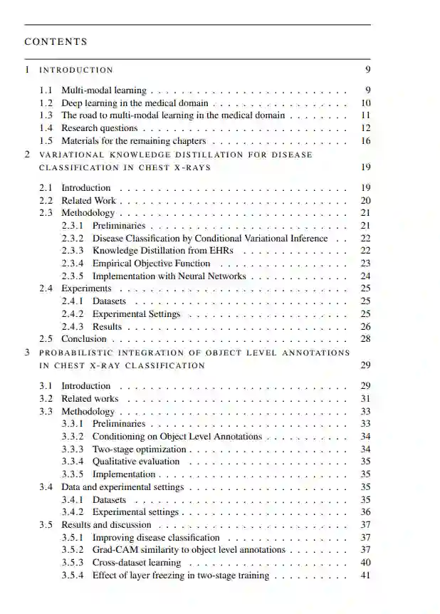 近年来,人工智能,尤其是深度学习模型在医学影像领域的整合,对疾病分类能力产生了重大影响。然而,仅依赖影像数据限制了全面捕捉患者诊断复杂性的能力。临床报告形式的文本数据提供了额外的宝贵见解,提供了丰富的临床信息,可以补充基于图像的分析。尽管具有潜力,但由于临床医生输入的变异性以及医学文本中信息水平的不同,将文本信息纳入疾病分类模型提出了重大挑战。本论文通过多模态学习的新方法和新途径应对这些挑战,旨在通过将影像数据与其他临床信息来源相结合来增强医学图像分析。本论文提出的工作的总体结论是,在医学领域跨不同模态的信息组合不仅是可能的,而且在大量场景中效果极佳。通过考虑更完整的患者数据表示,额外信息的加入使基于人工智能的分析在概念上更接近临床医生的分析。