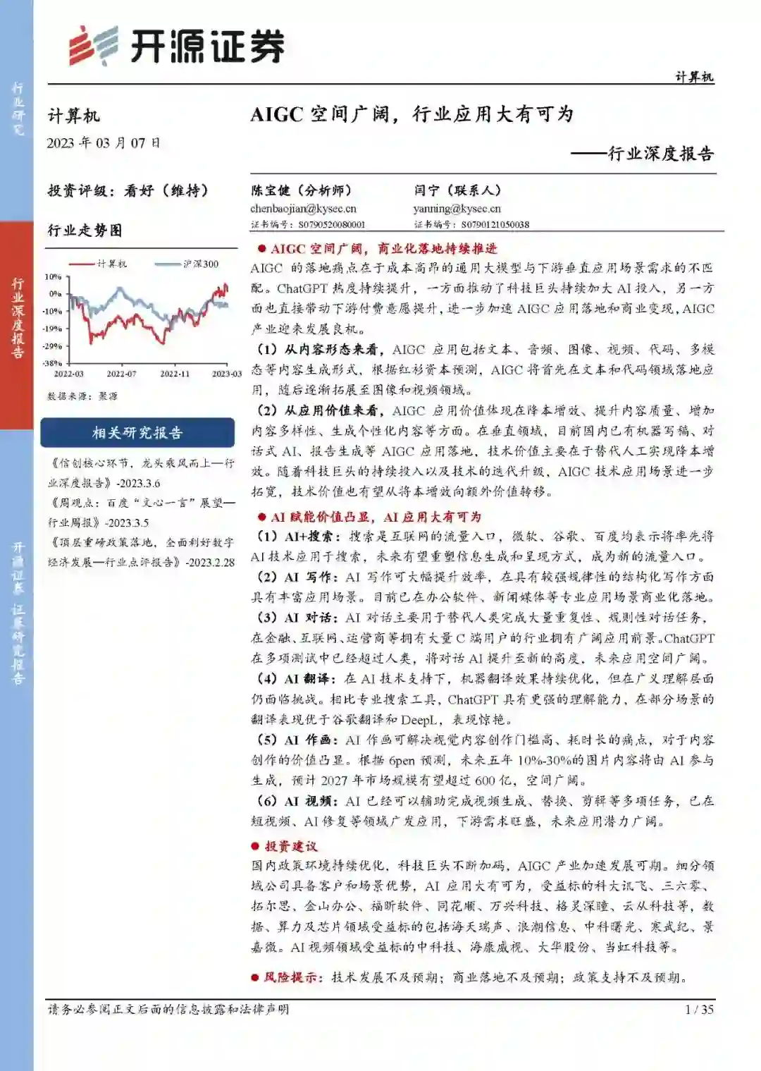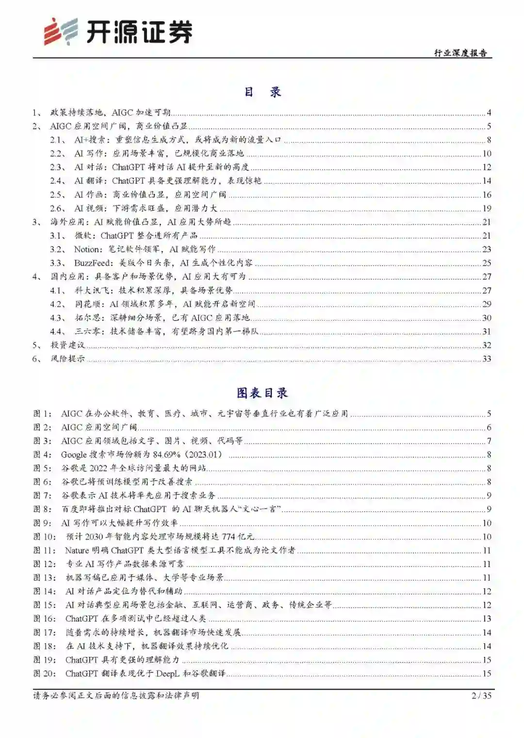 AIGC的落地痛点在于成本高昂的通用大模型与下游垂直应用场景需求的不匹配。ChatGPT热度持续提升,一方面推动了科技巨头持续加大AI投入,另一方面也直接带动下游付费意愿提升,进一步加速AIGC应用落地和商业变现,AIGC产业迎来发展良机。 (1)从内容形态来看,AIGC应用包括文本、音频、图像、视频、代码、多模态等内容生成形式,根据红衫资本预测,AIGC将首先在文本和代码领域落地应用,随后逐渐拓展至图像和视频领域。 (2)从应用价值来看,AIGC应用价值体现在降本增效、提升内容质量、增加内容多样性、生成个性化内容等方面。在垂直领域,目前国内已有机器写稿、对话式AI、报告生成等AIGC应用落地,技术价值主要在于替代人工实现降本增效。随着科技巨头的持续投入以及技术的迭代升级,AIGC技术应用场景进一步拓宽,技术价值也有望从将本增效向额外价值转移。 AI赋能价值凸显,AI应用大有可为 (1)AI+搜索:搜索是互联网的流量入口,微软、谷歌、百度均表示将率先将AI技术应用于搜索,未来有望重塑信息生成和呈现方式,成为新的流量入口。 (2)AI写作:AI写作可大幅提升效率,在具有较强规律性的结构化写作方面具有丰富应用场景。目前已在办公软件、新闻媒体等专业应用场景商业化落地。 (3)AI对话:AI对话主要用于替代人类完成大量重复性、规则性对话任务,在金融、互联网、运营商等拥有大量C端用户的行业拥有广阔应用前景。ChatGPT在多项测试中已经超过人类,将对话AI提升至新的高度,未来应用空间广阔。 (4)AI翻译:在AI技术支持下,机器翻译效果持续优化,但在广义理解层面仍面临挑战。相比专业搜索工具,ChatGPT具有更强的理解能力,在部分场景的翻译表现优于谷歌翻译和DeepL,表现惊艳。 (5)AI作画:AI作画可解决视觉内容创作门槛高、耗时长的痛点,对于内容创作的价值凸显。根据6pen预测,未来五年10%-30%的图片内容将由AI参与生成,预计2027年市场规模有望超过600亿,空间广阔。 (6)AI视频:AI已经可以辅助完成视频生成、替换、剪辑等多项任务,已在短视频、AI修复等领域广发应用,下游需求旺盛,未来应用潜力广阔。