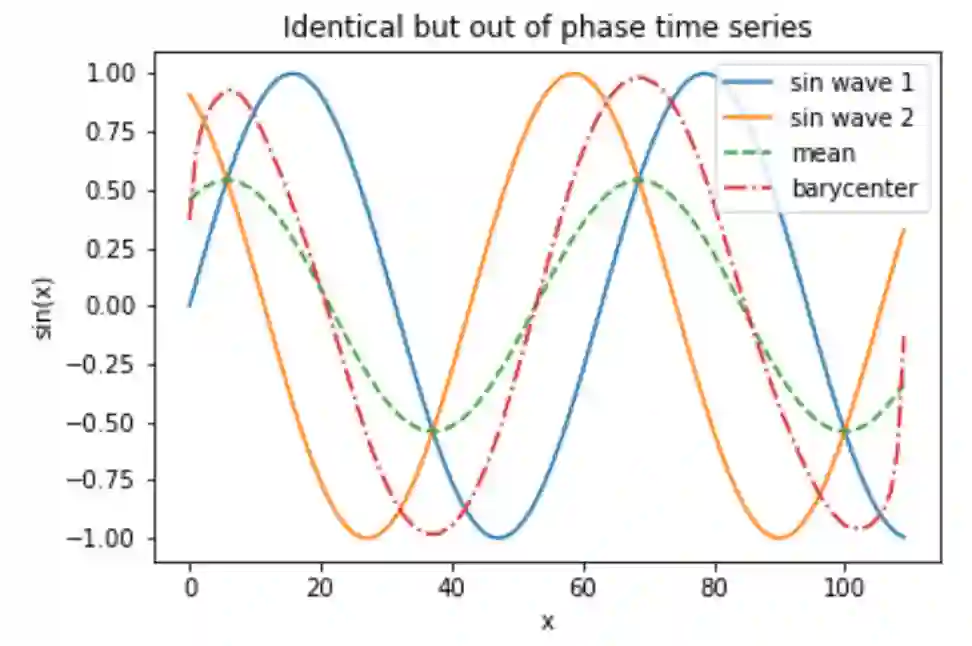 图 1. 除了相位之外,两个正弦波完全相同。如果使用欧几里德距离进行比较,它们将被认为远不如预期的相似。此外,时间序列质心计算通常最好使用 dtw 重心平均或其变体来完成。
