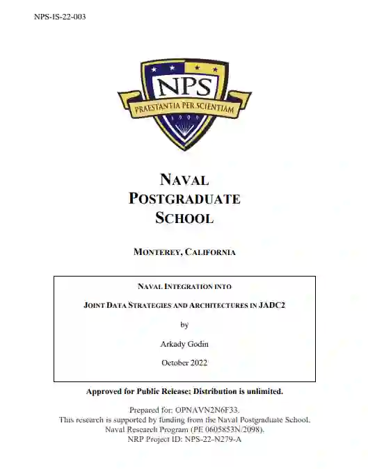 NRP20财年广泛领域研究[1]设计的数据战略的目的是 "描述美海军在未来分布式舰队中如何分析和传输数据"[2]。[1]的作者还规定:"由于信息和知识的质量在很大程度上取决于数据管理,后者被美国防部的创新者视为联合部队战斗空间中未来数字任务数据架构的基石,因为信息和知识的质量在很大程度上取决于它。" 在[1]中的最后一个分章 "未来研究领域 "中,作者总结道:"......执行这一战略将使海军能够加入为支持JADC2和其他当前概念而制定的任何联合数据。"