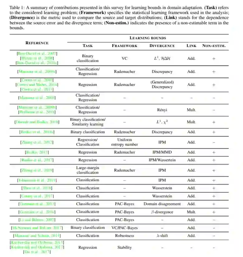 表1: 本综述中关于领域适应的学习范围的贡献总结。(任务)是指所考虑的学习问题;(框架)指定分析中使用的统计学习框架;(散度)是用来比较源分布和目标分布的度量;(Link)表示源误差与散度项之间的依赖关系;(Non-estim)表示在界限中存在一个不可估计的项。