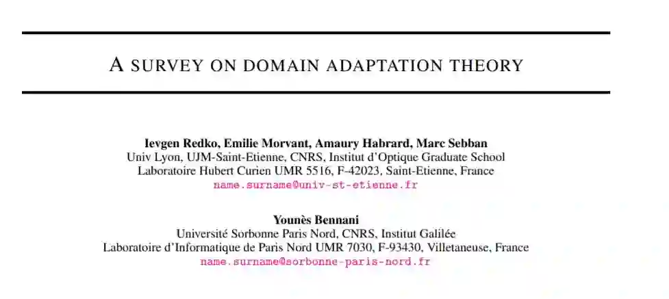 在本篇综述中,我们对领域自适应问题的现有理论进行了概述,这种学习设置扩展了传统的学习范式,使模型可以在来自不同但相关的概率分布的样本上学习和部署。所引用的理论结果通常采取一种学习边界的形式,其目标是将一个模型在训练(也称为源)域上的错误与测试(也称为目标)域上的错误联系起来。为此,我们注意到所提供的结果是非常直观的,因为它们明确地引入了上述两个错误之间的关系与它们的数据生成概率分布和相应的标记函数的相似性的依赖关系。因此,这种源域和目标域之间的双向关联,通过比较两个域的边缘分布和样本的可能标记来描述这两个域的无监督邻近性,通过寻找一个相对于它们具有低误差的良好模型。在这一主题的大多数已发表的结果中,以这样或那样的方式保留了这种普遍的权衡,因此可以被视为现代领域适应理论的基石。