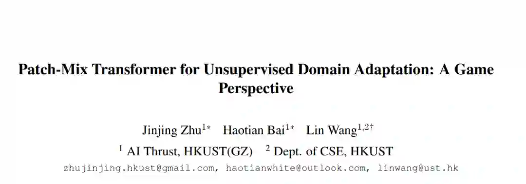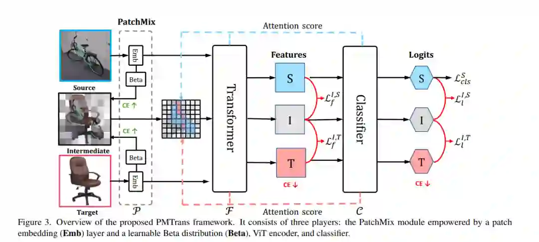 最近,人们努力利用视觉transformer (ViT)来完成具有挑战性的无监督域适应(UDA)任务。它们通常采用ViT中的交叉注意力来进行直接域对齐。然而,由于交叉注意力的性能高度依赖于目标样本的伪标签质量,当域差距较大时,交叉注意力的效果就会变差。本文从博弈论的角度解决这个问题,提出了PMTrans模型,将源域和目标域与中间域连接起来。提出了一个新的基于vit的模块PatchMix,通过学习基于博弈论模型从两个域采样补丁,有效地建立了中间域,即概率分布。通过这种方式,它学会混合来自源域和目标域的块以最大化交叉熵(CE),同时利用特征和标签空间中的两个半监督mixup损失来最小化它。将UDA的过程解释为一个有三个参与者的最小最大CE游戏,包括特征提取器、分类器和PatchMix,以找到纳什均衡。利用ViT的注意图,根据每个块的重要性重新加权每个块的标签,使其能够获得更具有领域区分性的特征表示。在四个基准数据集上进行了广泛的实验,结果表明,PMTrans在Office-Home上显著优于基于ViT和基于CNN的SoTA方法,分别在Office31和DomainNet上提高了3.6%、1.4%和17.7%。https: / / vlis2022.github.io / cvpr23 / PMTrans。