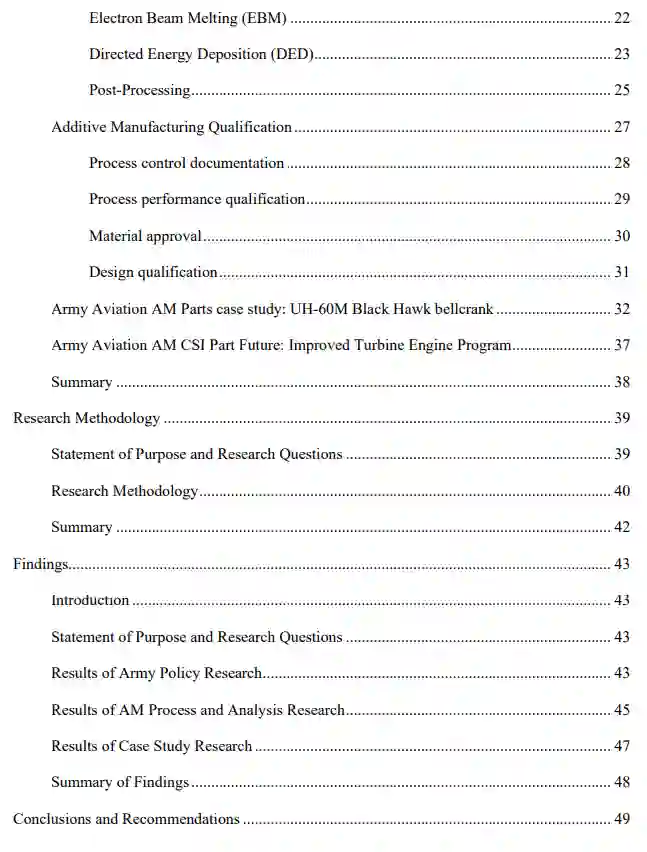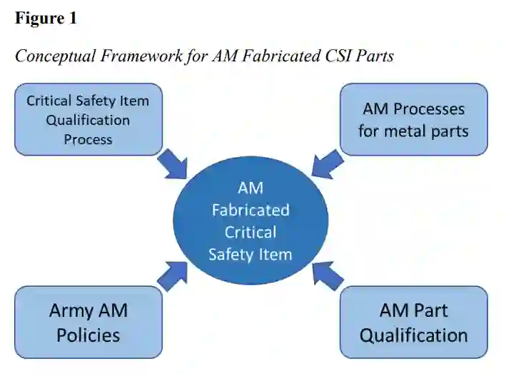本研究的概念框架定义了研究过程的目标。首先,本研究将提供一个陆军航空CSI资格认证过程的概述。本研究将简要讨论与AM和航空有关的陆军和国防部政策,以便为AM在陆军航空中的相关性提供背景。然后,本研究将提供适用于陆军旋翼飞机关键应用的金属部件制造的AM工艺研究。最后,本研究将以一个案例来结束,该案例提供了一个陆军旋转翼飞机上使用AM部件的鉴定过程的例子。图1显示了生产增材制造关键安全项目的研究的概念框架图。