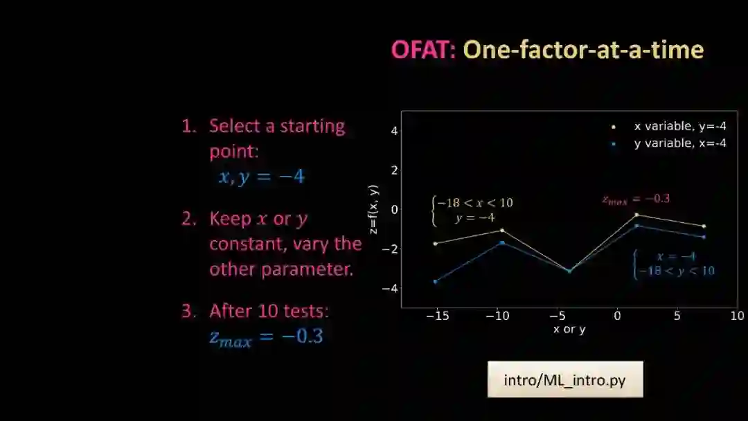 OFAT(单因素变动法) vs. DOE(实验设计) vs. 迭代式机器学习 传统机器学习方法简要回顾(神经网络、GPR、高斯过程回归、集成方法) 配套材料:幻灯片、代码