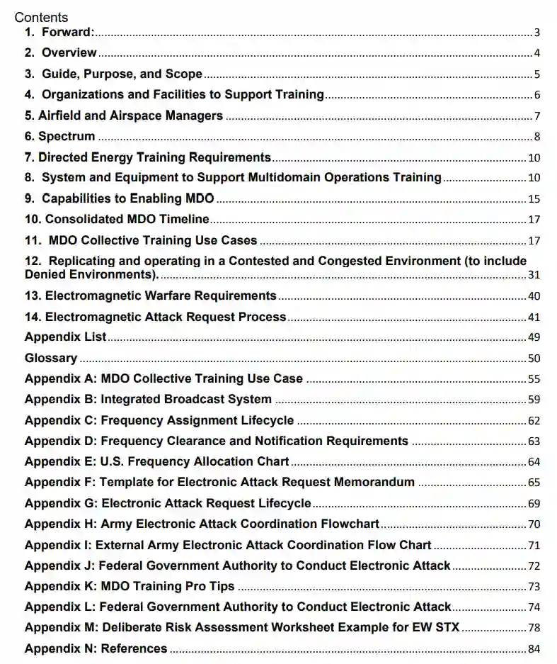 美国陆军卓越情报中心(USAICoE)与卓越网络中心(CCoE)联合开发《多域作战范围指南》,旨在指导驻训期间士兵、班组、单元及指挥官的情报与电磁战(I&EW)专项任务训练。该指南整合MITS、CEWTS、训练条令TC 25-8《陆军训练场》等权威文件,明确任务规划、执行与评估所需的资源、训练辅助设备、关键赋能要素、审批流程及地方授权机制。其通过设定最低绩效标准细化训练目标,并评估多域作战训练需求。作为支持陆军学习进程的动态文件,指南采用模块化架构,将任务按战备等级分类。针对每项任务,其评估训练大纲涵盖作战概念、任务执行通用条件、绩效衡量标准、以结果为导向的训练目标,以及目标模拟器、训练辅助设备、频谱、空域、威胁模拟系统、机动区域等保障需求。此外,指南提供士兵与单元的参考用例,并明确训练实施所需的角色职责、参谋协调与审批时限。