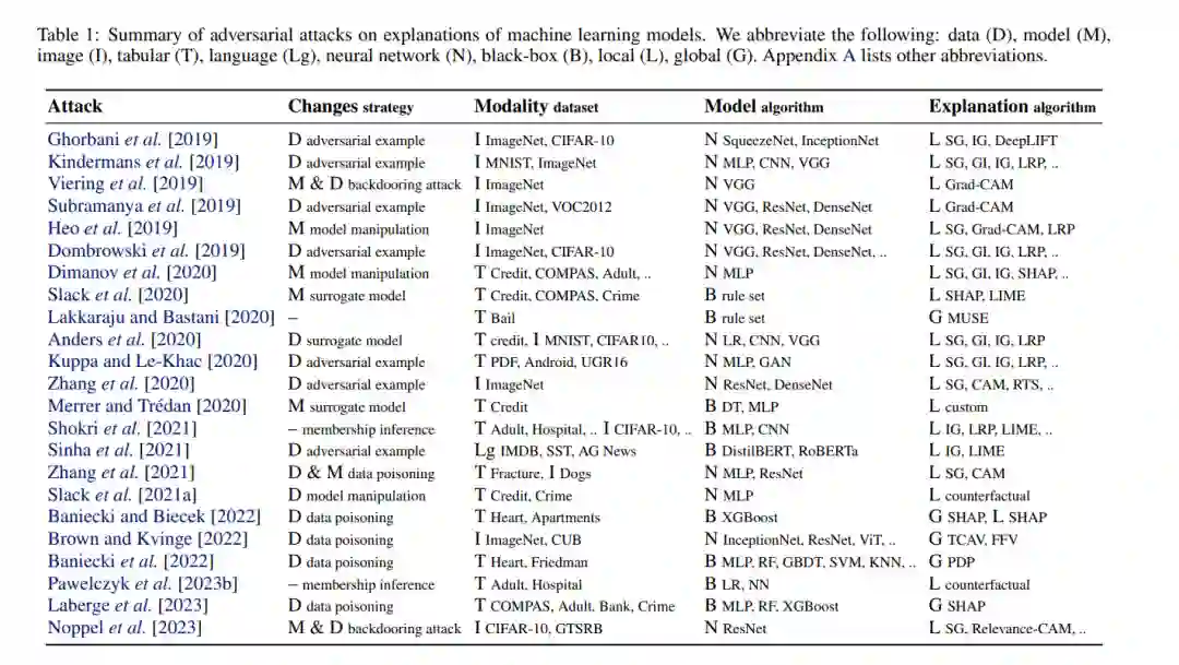 表1列出了对解释方法的攻击,以及相应的改变数据的策略,例如,对抗性示例会操纵解释而不影响预测 [Ghorbani et al., 2019; Dombrowski et al., 2019],改变模型,例如,微调或规范化权重会操纵解释而不影响预测性能 [Heo et al., 2019; Dimanov et al., 2020],或同时改变数据和模型,例如,在攻击者对训练数据集进行投毒的情况下 [Zhang et al., 2021]。Viering et al. [2019]通过改变其权重来操纵卷积神经网络的Grad-CAM解释,但也提出在网络中留下一个后门(由特定输入模式触发),这允许检索原始解释。Noppel et al. [2023]通过微调和后门扩展愚弄解释,以考虑:(i)一种红鲱鱼攻击,该攻击操纵解释以掩盖模型预测的对抗性变化,例如,误分类,和(ii)一种完全伪装的攻击,该攻击旨在为改变的预测展示原始解释。