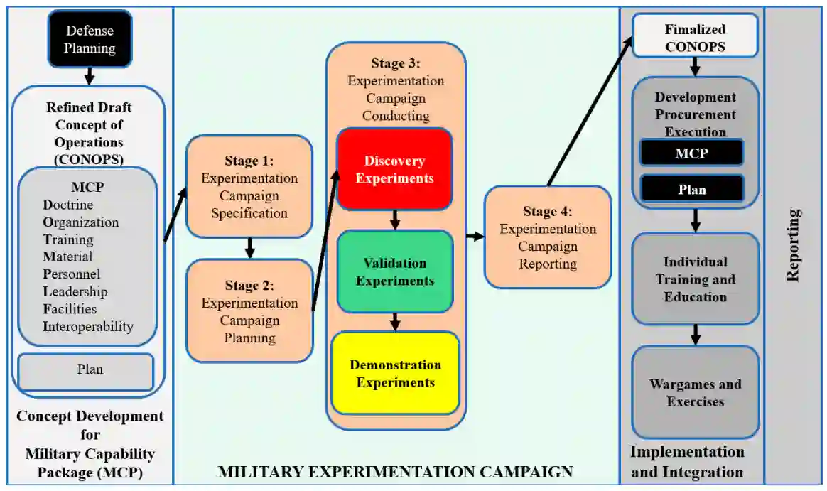 第2节首先介绍了所有领域的军事转型流程以及它们之间的联系。然后,解释军事实验活动中每个阶段的流程和产出。我们还确定了支持军事实验各阶段的建模与仿真工具和方法。