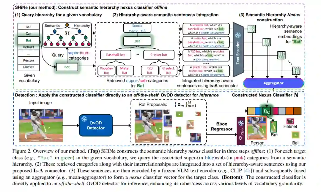 开放词汇目标检测(OvOD)将检测转变为一个由语言引导的任务,使用户能够在推理过程中自由定义他们感兴趣的类别词汇。然而,我们的初步研究表明,现有的OvOD检测器在处理不同语义粒度的词汇时表现出显著的差异性,这对实际应用提出了挑战。为此,我们引入了语义层次枢纽(Semantic Hierarchy Nexus,SHiNe),这是一种利用类层次语义知识的新型分类器。它通过三个步骤离线运行: i) 从层次结构中检索每个目标类别的相关上位/下位类别; ii) 将这些类别整合成层次感知句子; iii) 融合这些句子嵌入生成枢纽分类器向量。我们在各种检测基准上的评估表明,SHiNe增强了跨不同词汇粒度的鲁棒性,在使用真实层次结构时实现了高达+31.9%的mAP50提升,同时在使用大语言模型生成的层次结构时也保持了改进。此外,应用于ImageNet-1k的开放词汇分类时,SHiNe将CLIP零样本基线提升了+2.8%的准确率。SHiNe无需训练,可以无缝集成到任何现成的OvOD检测器中,并且在推理过程中不会增加额外的计算开销。代码是开源的。 https://arxiv.org/abs/2405.10053