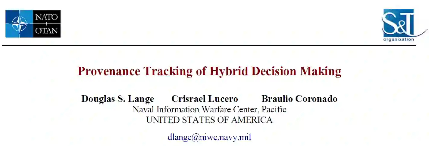 记录一个系统或集成系统内所有信息变化的出处,这提供了关于正在做出的决定和促使这些决定的重要信息。从取证的角度来看,这可以用来重新创建决策环境。然而,出处也可以为其他两个重要功能服务。收集的数据可以支持组件的整合,而生成的图形数据结构可以通过解释、总结和告警来支持操作员进行态势感知。混合战争将必然汇集不同决策支持能力,因为决策者必须在多个战争领域运作。自主代理将可能在计划和执行过程中发挥作用,有时能够在没有人类干预的情况下做出决定,但人类决策者必须意识到这一点。事实证明,证据图可以转化为修辞结构图(RSG),使代理能够用自然语言甚至多模态交流,向人类解释他们的行动。证据还被证明可以加强对计划执行监控,并可用于向人类或自主代理提供通知,当计划中使用的信息发生变化时,可能需要重新考虑计划。随着我们朝着智能机器在复杂环境中支持人类决策者团队的方向发展,跟踪决策及其输入的需要变得至关重要。