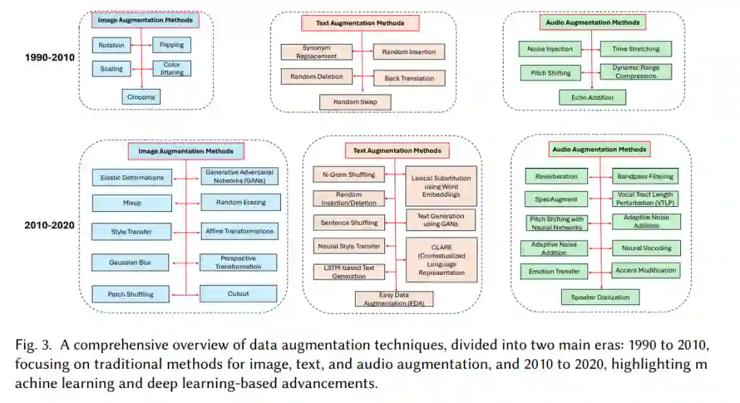 本文结构如下:第二部分概述了方法论;第三部分简要介绍了背景,将数据增强技术分为传统方法(1990–2010)和ML/DL方法(2010–2020);第四部分,结果与讨论,展示了图像、文本和语音模态的发现,分析了基于LLM的增强技术、其局限性以及潜在的解决方案;最后,第六部分,结论,总结了见解,讨论了未来的研究方向,并突出了LLM应用在数据增强中的演变。2. 数据增强的背景与演进2.1 传统数据增强方法(1990-2010)在1990年代至2010年期间,数据增强主要依赖于手动设计的变换函数。这些方法虽然简单且计算量小,但在增强数据集规模和多样性的同时,也带来了一些局限性。例如,图像旋转和翻转可能会导致重要信息的丢失,缩放操作可能导致像素化和分辨率下降,颜色抖动可能使图像显得不自然。2.1.1 图像数据增强传统的图像数据增强方法主要包括几何变换(如旋转、翻转、缩放)和颜色变换(如颜色抖动、直方图均衡化)。这些方法虽然能够有效增加数据集的多样性,但在处理复杂场景时往往表现不佳,尤其是在需要保留图像细节和语义信息的任务中。2.1.2 文本数据增强文本数据增强的早期方法包括同义词替换、随机删除、随机插入和回译等。这些方法虽然能够增加文本的多样性,但在处理复杂的语义和上下文时往往表现不佳,容易引入不恰当的词汇或破坏文本的语法结构。2.1.3 语音数据增强语音数据增强的早期方法主要包括噪声注入、音高变换和时间拉伸等。这些方法虽然能够模拟不同的声学环境,但在处理复杂的语音信号时往往表现不佳,容易引入失真或过度拟合特定的噪声类型。2.2 机器学习和深度学习驱动的数据增强(2010-2020)随着机器学习和深度学习技术的快速发展,数据增强方法也变得更加自动化和智能化。特别是生成对抗网络(GANs)和变分自编码器(VAEs)等生成模型的引入,使得数据增强能够生成更加逼真和多样化的数据。2.2.1 图像数据增强在2010年至2020年期间,基于深度学习的图像数据增强方法得到了广泛应用。例如,MixUp技术通过混合图像和标签来防止过拟合,风格迁移和GANs能够生成风格各异的合成图像,从而丰富训练数据集。这些方法在医学影像、自动驾驶和农业等领域取得了显著成果。2.2.2 文本数据增强基于深度学习的文本数据增强方法包括n-gram重排、词嵌入替换和神经风格迁移等。这些方法能够生成更加多样化和语义一致的文本数据,从而提升自然语言处理模型的性能。2.2.3 语音数据增强深度学习技术的引入使得语音数据增强方法变得更加复杂和多样化。例如,噪声注入和时间拉伸等方法能够模拟不同的声学环境,从而提升语音识别系统的鲁棒性。2.3 多模态大语言模型驱动的数据增强(2020年至今)随着多模态大语言模型(如GPT-4、DALL-E等)的出现,数据增强技术迎来了新的变革。这些模型不仅能够处理单一模态的数据,还能够跨模态生成更加复杂和多样化的数据。例如,DALL-E能够根据文本描述生成逼真的图像,GPT-4能够生成高质量的文本数据。3. 基于多模态大语言模型的图像数据增强3.1 技术流程基于多模态大语言模型的图像数据增强通常包括以下几个步骤:图像编码:将原始图像转换为可计算的格式,通常使用视觉编码器将图像信息提取为特征向量。提示生成:大语言模型根据编码后的图像生成文本描述,这些描述将作为后续增强步骤的指导。增强指令生成:根据文本描述生成详细的变换指令,如图像旋转、缩放、裁剪等。自然语言到代码转换:将生成的指令转换为可执行的代码。代码执行:将生成的代码应用于原始图像,实现所需的增强操作。质量评估:评估增强后的图像质量,确保其符合高质量标准。元数据生成:记录增强操作的详细信息,便于后续分析和复现。数据集集成:将增强后的图像和元数据集成到训练数据集中,提升模型的鲁棒性和泛化能力。3.2 方法与技术基于多模态大语言模型的图像数据增强方法多种多样,主要包括以下几种:图像到文本合成:通过大语言模型生成图像的文本描述,从而增强图像的语义信息。例如,DF-GAN模型通过简化生成过程,提高了文本与图像语义的一致性。语义内容迁移:将语义相关的对象插入到现有图像中,从而增强模型的泛化能力。例如,SemAug方法通过动态插入语义相关的对象,显著提升了对象检测模型的性能。图像描述生成:通过大语言模型生成详细的图像描述,从而增强图像与文本的对齐。例如,FuseCap方法通过结合机器视觉和大语言模型的输出,生成了更加丰富的图像描述。条件图像生成:根据复杂的文本和图像输入生成图像。例如,UNIMO-G模型通过多模态条件扩散框架,生成了更加详细的图像。上下文对象插入:在图像中插入上下文相关的对象,从而增强模型的检测能力。例如,SemAug方法通过计算和插入新的对象,显著提升了模型的mAP(平均精度)。交互式编辑:结合用户输入和大语言模型,对图像进行交互式编辑。例如,Visual Editing GPT 3.5模型通过蒸馏方法,显著提升了实时视觉编辑任务的性能。场景补全:通过大语言模型和扩散模型生成高质量的训练图像,从而增强语义分割模型的性能。例如,Image Augmentation Agent(IAA)模型通过生成多样化的训练图像,显著提升了语义分割的准确性。自动裁剪:通过大语言模型智能裁剪图像,突出图像的关键部分。例如,DIAGen模型通过高斯噪声和类别特定的文本提示,优化了图像的焦点。属性生成: