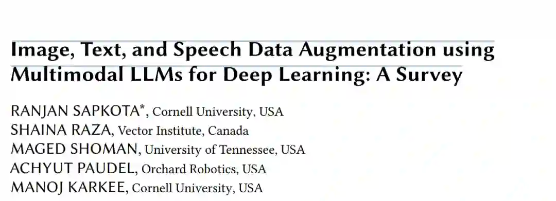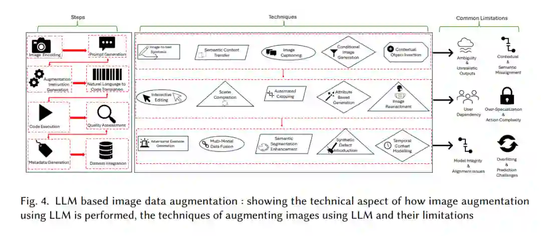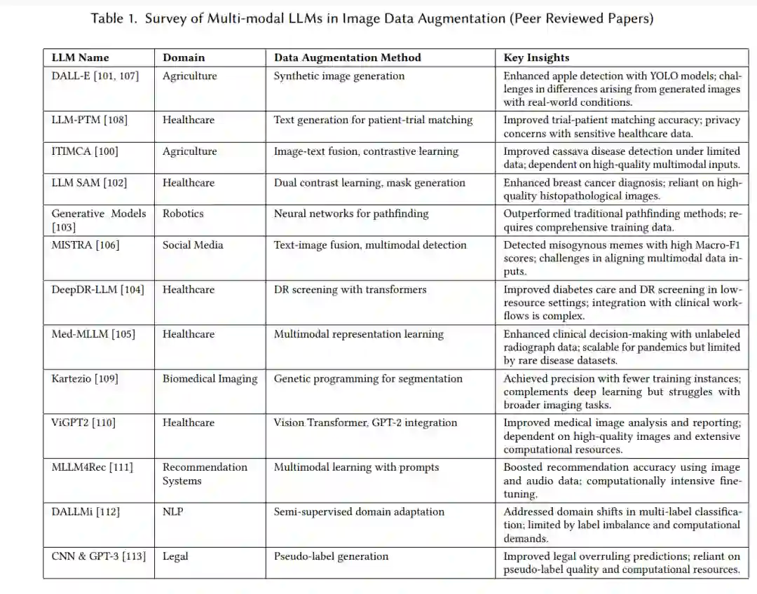 在过去的五年里,研究方向已从传统的机器学习(ML)和深度学习(DL)方法转向利用大语言模型(LLMs),包括多模态方法,用于数据增强,以提高泛化能力,并在训练深度卷积神经网络时防止过拟合。然而,现有的综述文章主要集中于机器学习和深度学习技术或有限的模态(如文本或图像),在涵盖LLM方法的最新进展和多模态应用方面仍存在空白。本文通过探索利用多模态LLMs进行图像、文本和语音数据增强的最新文献,填补了这一空白,提供了对这些过程的全面理解。我们概述了在基于LLM的图像、文本和语音增强中使用的各种方法,并讨论了当前方法中存在的局限性。此外,我们还从文献中识别了潜在的解决方案,以增强使用多模态LLMs进行数据增强的效果。本文为未来的研究奠定了基础,旨在改进和扩展多模态LLMs在提高深度学习应用数据集质量和多样性方面的使用。论文GitHub链接:https://github.com/WSUAgRobotics/data-aug-multi-modal-llm。 附加关键词:数据增强、大语言模型(LLMs)、生成式人工智能、图像增强、文本增强、语音增强、深度学习 1. 引言
