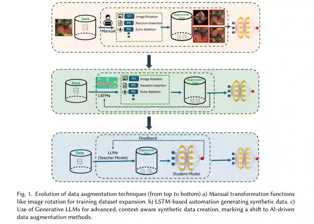 数据增强是机器学习(ML)中的一项基础技术,通过生成现有数据样本的修改版本来增加训练数据集的大小和多样性[1, 2]。这一实践使用各种转换函数(TFs),如旋转图像或改变文字等方法,调整原始数据以产生新的变体,如图1所示。数据操作专家曾手动应用这些TFs生成新的示例,帮助更有效地训练深度学习模型。具体来说,图像旋转、Gaussian模糊、放大/缩小(图1)等TFs能够将一张来自果园的苹果图像转换成多个不同的方向,从而有效地增加针对图像处理模型的训练数据集大小。类似的文本和语音数据的TFs,如随机插入和特定的音频修改,分别扩大了自然语言处理(NLP)和音频分析应用的数据集[3, 4]。这些增强策略不仅增加了用于训练的数据量,还引入了模型可能在现实场景中遇到的各种变异,从而增强了模型的鲁棒性和泛化能力。图1a通过可视化展示了数据增强的基础实践,以旋转的苹果图像为例。 传统上,数据增强是手动执行的,但随着长短期记忆(LSTM)网络的出现,它变得更加自动化和广泛应用[5, 6]。LSTM使得在各种应用中自动生成合成数据成为可能,包括时间序列预测、自然语言处理(NLP)和人体活动识别[7]。这一转变减少了对手动数据创建的依赖,如图1b所示,图中展示了基于LSTM的数据增强的过渡过程。 基于LSTM的增强方法成为数据驱动领域的基石,直到大语言模型(LLMs)和生成式人工智能的出现。随着ChatGPT等创新的流行,LLMs开始重新定义数据增强,尤其是通过集成和自动化跨模态合成。如图1c所示,这个新时代利用多模态LLMs的上下文智能来执行数据增强。这些方法不仅超越了传统和基于LSTM的方法,还通过提供跨多种数据类型的更复杂、上下文相关的合成数据生成,进一步提升了数据增强的能力。 数据增强对于提高深度学习(DL)模型在计算机视觉、NLP和语音识别等各个领域的鲁棒性和性能至关重要。在计算机视觉中,诸如随机裁剪和翻转等技术通常用于通过促进不同方向和表达方式的泛化来防止过拟合[8]。类似地,在NLP中,同义词替换和释义重述帮助模型在多样的词汇和语言结构中实现泛化,这对于情感分析和聊天机器人等应用至关重要[2, 9]。在语音识别领域,噪声注入等策略使模型能够在噪声环境中可靠运行,通过模拟各种声学场景[10, 11]。 数据增强使模型能够在多种条件下进行训练,例如自动驾驶中的光照或医学影像中的情境,减少了对昂贵数据收集的依赖[12–15]。它还解决了类别不平衡问题,并增强了数据集的多样性,这对于需要在现实环境中实现高准确度的任务,如机器翻译和声音识别至关重要[16, 17]。数据增强通过合成增加训练数据,降低成本,加快开发,并最大化数据资源的投资回报率[2, 18]。 在现有数据增强方法的基础上,多模态LLMs的出现为该领域带来了许多变化。这些模型不仅超越了机器翻译和情感分析等传统应用,还引入了用于分类的伪数据生成和回归分析的数据集增强[19, 20]。这一转变引入了更动态和功能性的增强技术,这些技术不仅丰富了可用的方法,还加深了我们对模型训练和性能的理解[21]。
