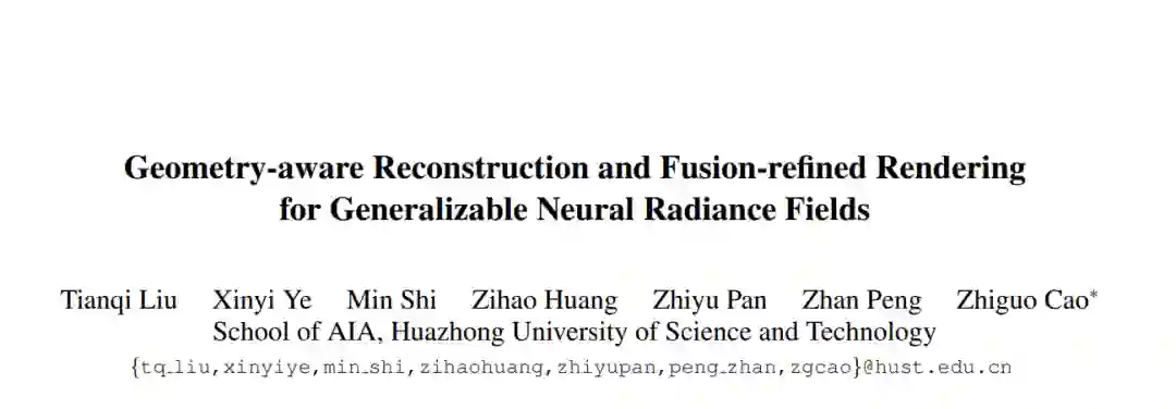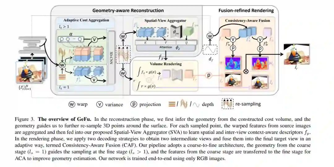 泛化NeRF的目标是为未见过的场景合成新的视角。常见做法包括构建基于方差的成本体积用于几何重建,并编码3D描述符用于解码新视角。然而,现有方法在具有挑战性的条件下显示出有限的泛化能力,这是由于几何不准确、描述符次优和解码策略等因素造成的。我们逐点解决这些问题。首先,我们发现基于方差的成本体积展示出失败模式,因为由于遮挡或反射,对应于同一点的像素的特征在不同视角中可能不一致。我们引入了一种自适应成本聚合(ACA)方法,以增强一致像素对的贡献并抑制不一致的像素对。与之前仅将2D特征融合进描述符的方法不同,我们的方法引入了一个空间-视图聚合器(SVA),通过空间和视图间交互将3D上下文融入描述符。在解码描述符时,我们观察到两种现有的解码策略在不同领域表现出色,它们是互补的。我们提出了一种一致性感知融合(CAF)策略,以利用这两者的优势。我们将上述ACA、SVA和CAF融合进一个粗到细的框架中,称为面向几何感知的重建与融合精炼渲染(GeFu)。GeFu在多个数据集上达到了最先进的性能。代码可在https://github.com/TQTQliu/GeFu 获取。