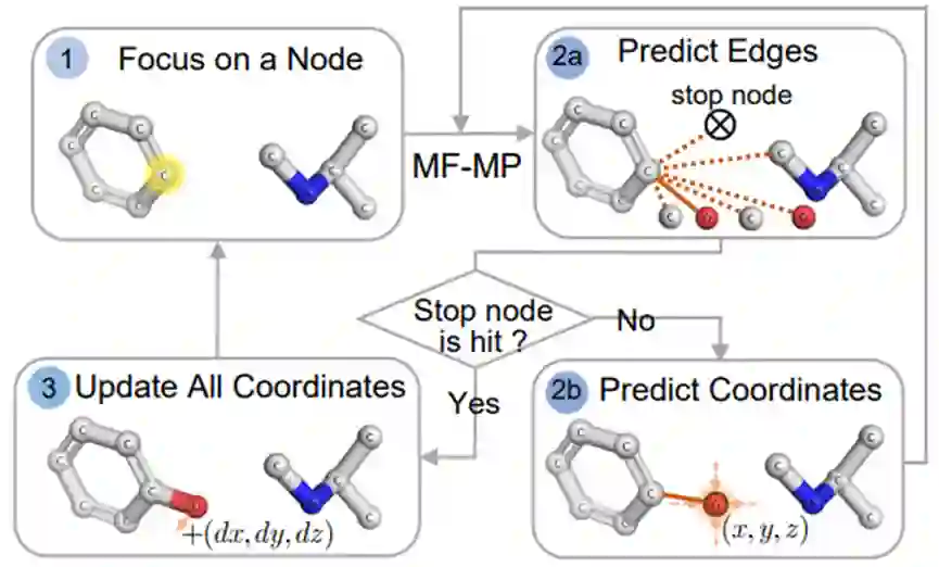 解码器的目的是根据分子片段的不变与等变特征,以顺序方式逐步构造完整的目标连接图过程。具体如下图,首先预测两个分子片段上的锚点信息,以此作为连接器的拼接位置。其次,预测连接器中所有原子的类型。而后,预测连接器中原子之间的边以及相应的3D坐标信息。该过程中以不变与等变特征形式进行连接器的特征描述,进而保证连接器的理论有效性。