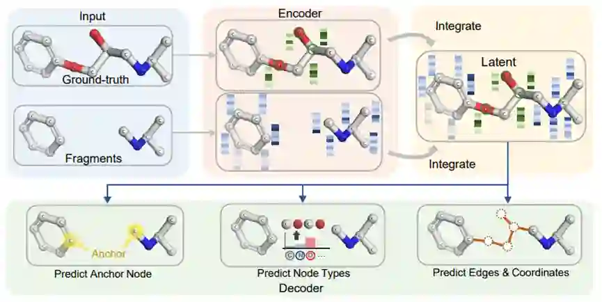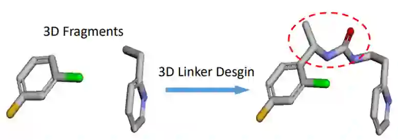 在药物研发中,由于搜索空间的离散性和庞大性,设计包含所需药效团特性的新分子药物仍具有挑战性。近期,一种独特的药物分子将两个具有生物功能的片段分子与接头分子相结合,进而表现出分子接合策略的巨大应用潜力。然而,该策略中的关键点是分子连接器的设计,目前此过程仍依赖于专业的结构生物学家,因此需要一种有效的深度学习方法来解决该问题。 如图1,分子连接器的生成问题可定义为:给定两个具有坐标信息的分子片段图,生成一个包含坐标信息的连接图,用于拼接上述两个片段。同时,生成的连接图坐标需要在空间中与片段相对齐。
