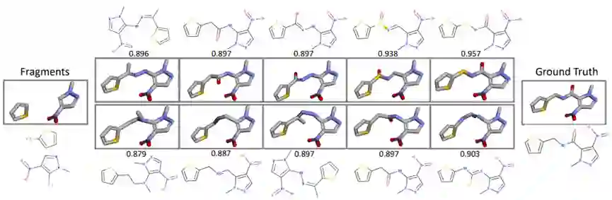 同时,作者随机选取分子片段的连接过程,并可视化与真实分子相似性最高的五种连接器推断,可以发现3DLinker相较于基准DeLinker+ ConfVAE模型,在预测的指标和实际效果上均有较高的优势。