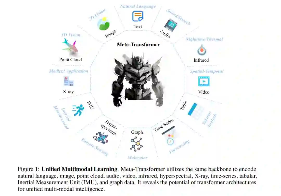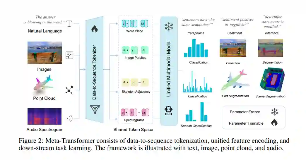 但由于它们之间固有的差距,设计一个用于处理各种模态(例如自然语言、2D图像、3D点云、音频、视频、时间序列、表格数据)的统一网络仍然具有挑战性。在这项工作中,我们提出了一个名为Meta-Transformer的框架,它利用一个固定的编码器在没有任何成对的多模态训练数据的情况下执行多模态感知。在Meta-Transformer中,来自各种模态的原始输入数据被映射到一个共享的令牌空间,允许一个具有固定参数的后续编码器提取输入数据的高级语义特征。Meta-Transformer由三个主要组件组成:一个统一的数据令牌化器、一个模态共享的编码器和用于下游任务的任务特定头部。Meta-Transformer是第一个能够在12种模态上执行统一学习并使用非配对数据的框架。在不同基准上的实验显示,Meta-Transformer可以处理包括基本感知(文本、图像、点云、音频、视频)、实际应用(X射线、红外、超光谱和IMU)和数据挖掘(图、表格和时间序列)在内的广泛任务。Meta-Transformer为使用变换器开发统一的多模态智能展示了一个有前景的未来。代码将在 https://github.com/invictus717/MetaTransformer 上提供。