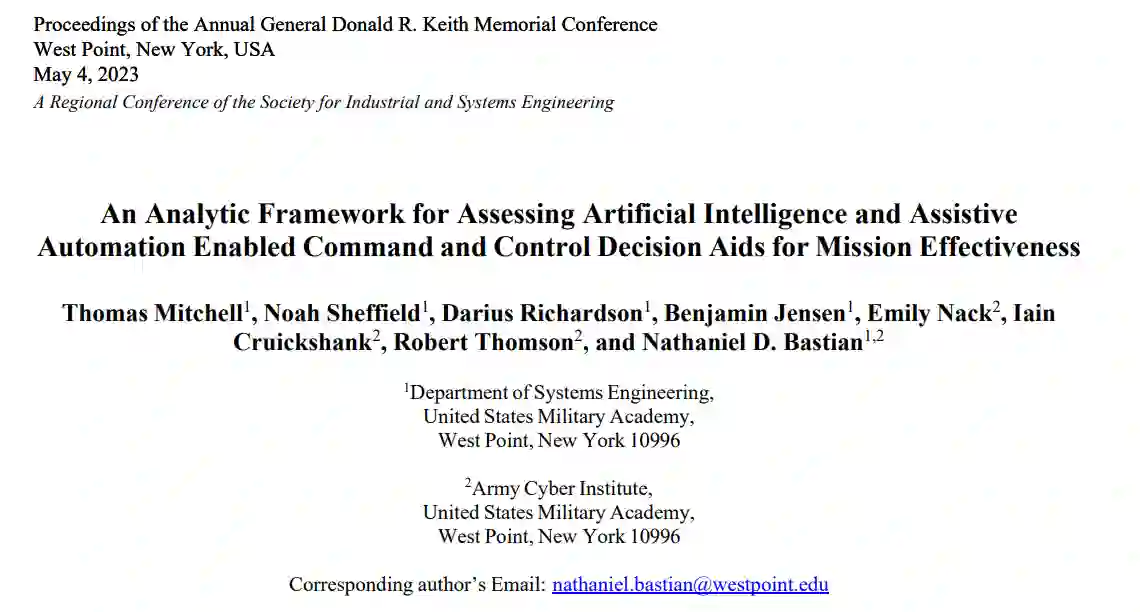 美国陆军目前正在开发决策辅助系统,将人工智能和辅助自动化(AI/AA)技术纳入作战空间。根据美国陆军机动中心的说法,士兵在决策辅助系统等人工智能/自动化系统的协助下,战斗效率可提高10倍(Aliotta,2022)。决策援助是一种工具,旨在协助指挥官在战斗场景中减少他们的决策时间,同时提高决策质量和任务效率(Shaneman, George, & Busart, 2022);这些工具有助于整理作战数据流,协助指挥官进行战场感知,以帮助他们做出明智、实时的决策。与使用AI/AA决策辅助工具相关的一个问题是,陆军目前缺乏一个有效的框架来评估工具在作战环境中的使用。因此,在本文中,我们描述了我们的研究、设计和开发的分析框架,并结合建模和仿真,以评估AI/AA决策辅助工具在任务有效性方面的情况。