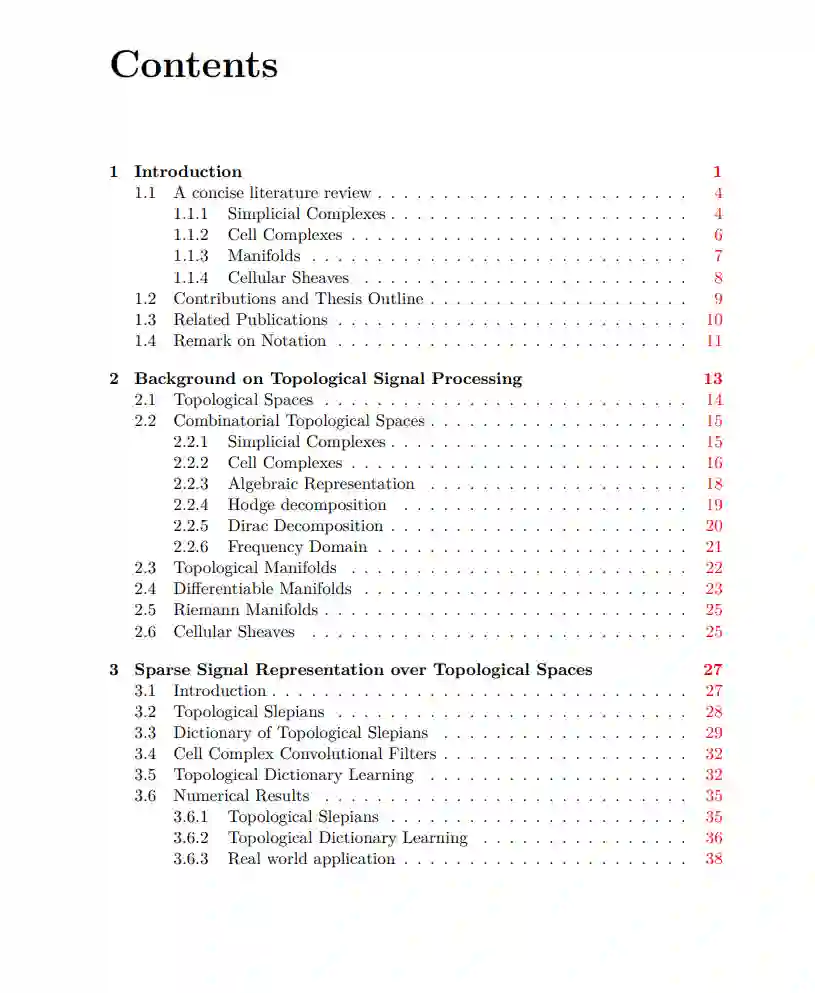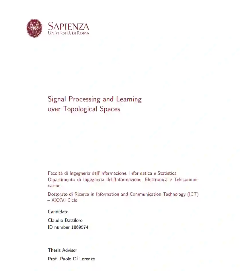 本论文的目的是介绍一系列特别设计的信号处理方法论,用于建模、解释和学习在拓扑空间内结构化的数据。这些空间大致被描述为一组点及点之间的邻域概念。在此讨论的方法和工具,当应用于在组合拓扑空间(如单元复合体)上定义的信号,或在展示非平凡属性的度量空间内(如具有非平坦度量的黎曼流形)时,具有特别的相关性和实用性。本研究背后的一个主要动机是解决和克服在传统图基表示中遇到的限制,当它们用来描述复杂系统时。本论文强调需要考虑到复杂的、多方面的、对几何敏感的相互作用,这些通过传统图模型无法充分捕捉。