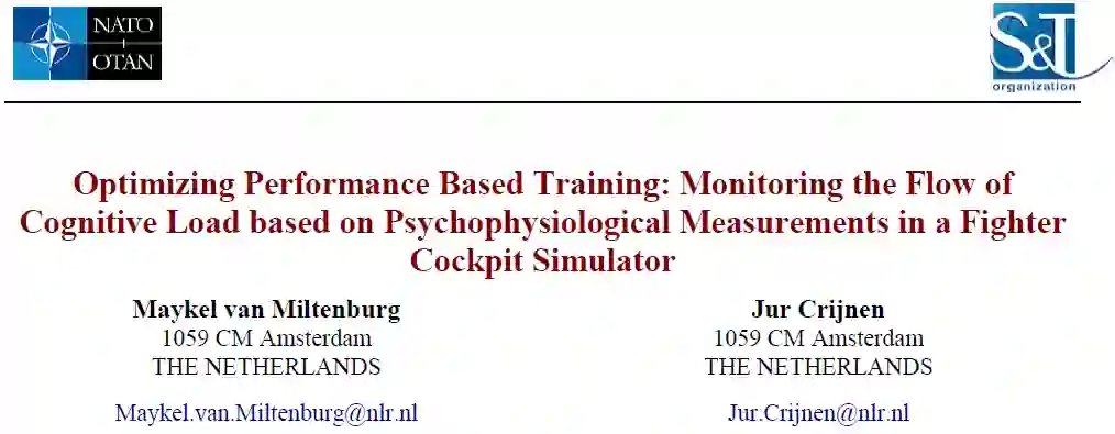 目前战斗机飞行员的训练几乎无一例外地是按固定的小时数和特定的时间安排设计的。基于绩效的训练是一种旨在优化训练的概念,最好是个性化的方式。它是关于事先防止训练/表现差距,而不是事后解决它们。有效的个性化学习假设所提供的学习任务具有最佳难度水平。为此,本文提出了一种基于多种认知负荷指标的飞行员认知负荷实时分类优化负荷模型。该研究旨在测试脑电图(更具体地说,是个人的上波段功率和θ波段功率),作为战斗机驾驶舱环境中该模型的认知负荷指标之一。共有4人参加,他们都是前F-16飞行员。每个参与者都进行了三次多次跑步。第一次测试(记忆测试)的认知负荷预计会比最后一次测试(性能测试)的认知负荷更高。与记忆测试相比,表现测试中的表现和主观工作量分别更高和更低,而认知负荷指标显示两种测试之间的混合结果,这可以归因于个体间和个体内的高差异。