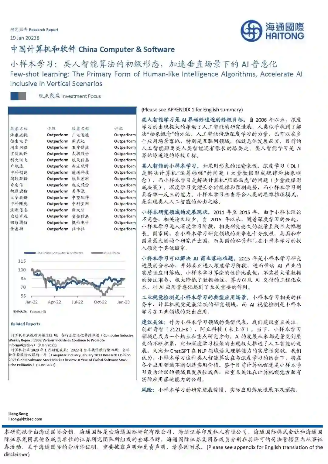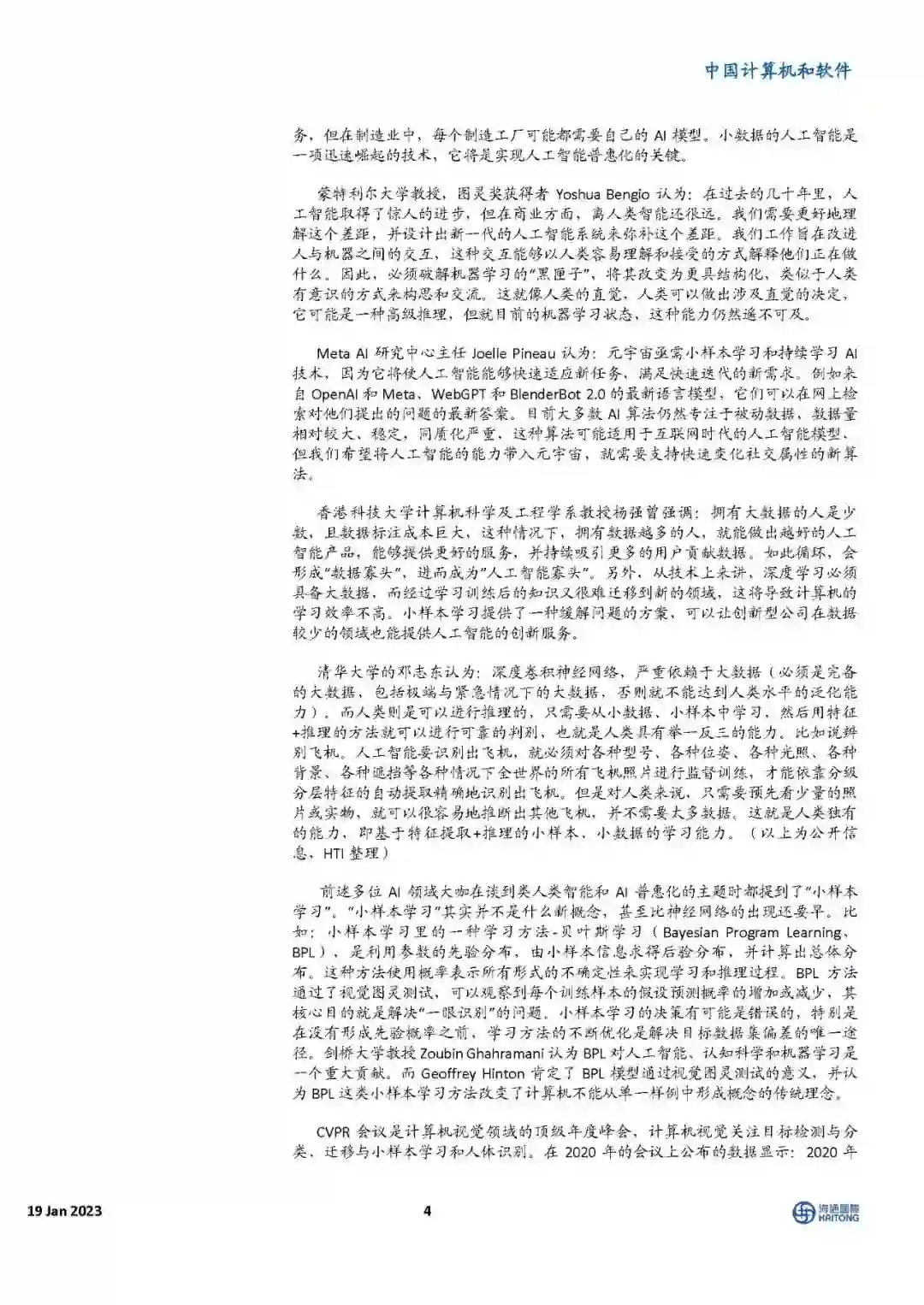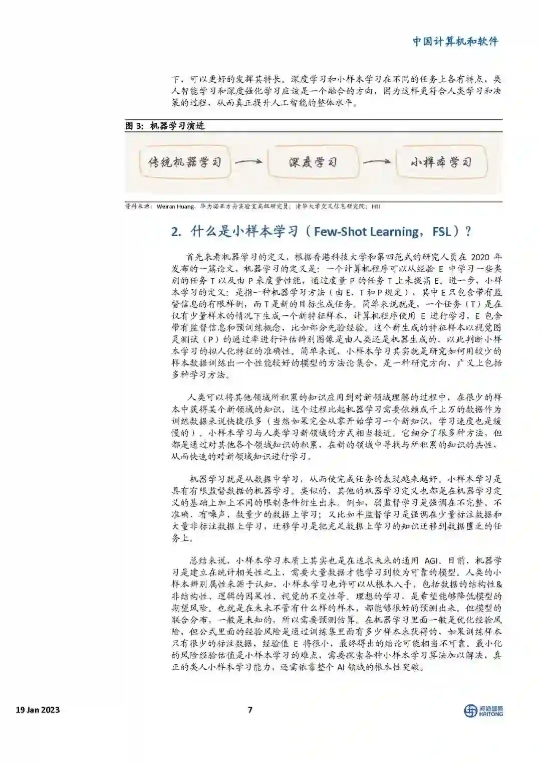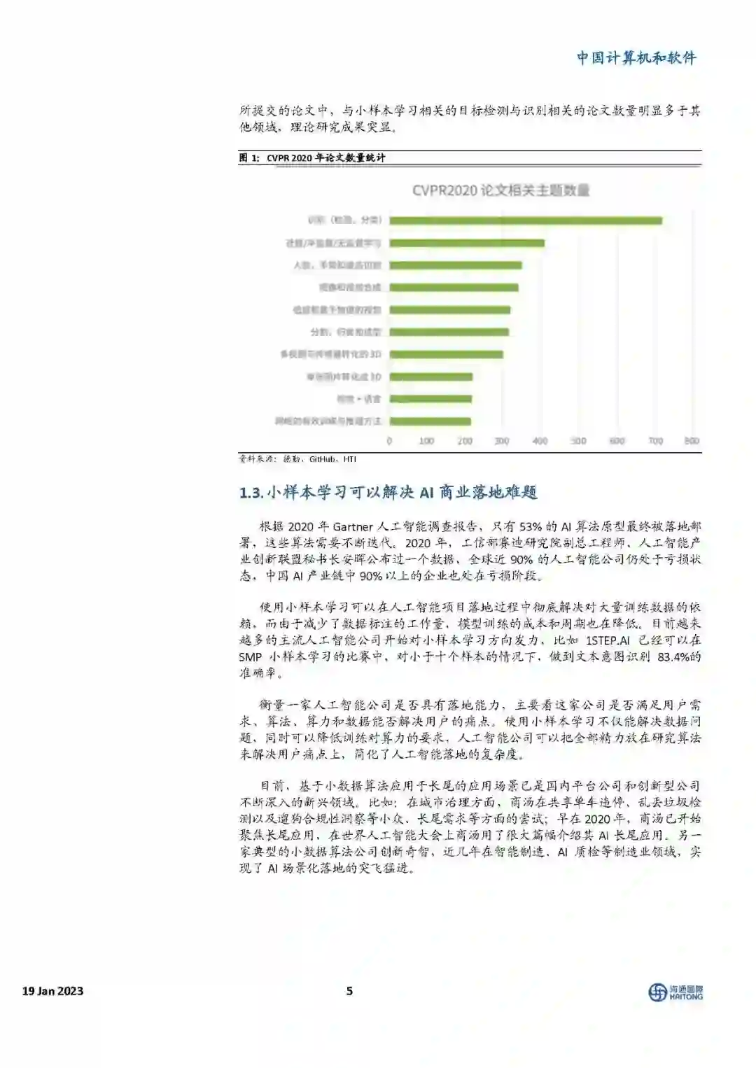 类人智能的小样本学习。如果用形象的比喻来说,深度学习(DL)是解决计算机“运筹帷幄”的问题(大量数据形成规律和抽象概念),而小样本学习是解决计算机“照猫画虎”的问题(少量数据形成决策)。深度学习更擅长分析规律和预测趋势,而小样本学习则具备举一反三的能力。小样本学习相当符合人类的思维推理模式,是实现类人人工智能的必由之路。 小样本研究领域的发展现状。2011年至2015年,由于小样本理论不完整,相关论文较少。自2015年以来,随着深度学习的兴起,小样本学习进入深度学习阶段,相关研究论文的数量呈线性大幅增长。国家间,在小样本学习研究领域的竞争也十分激烈,美国和中国是最大的两个研究产出国,而美国的私营部门在小样本学习的投入领先于其他国家。 小样本学习可以解决AI商业落地难题。2015年是小样本学习研究进展的分水岭,开始真正进入深度学习阶段,进而带动AI产业的实质性应用落地。小样本学习算法的性价比最优,不需要大量数据的标注准备,极大降低了数据标注、算力以及AI交付的工程化成本,对AI应用普惠化起到了至关重要的作用。 工业视觉检测是小样本学习的典型应用场景。小样本学习相关的任务中,计算机视觉是最活跃的研究领域,而AI视觉检测是小样本学习在工业领域的突出应用。
