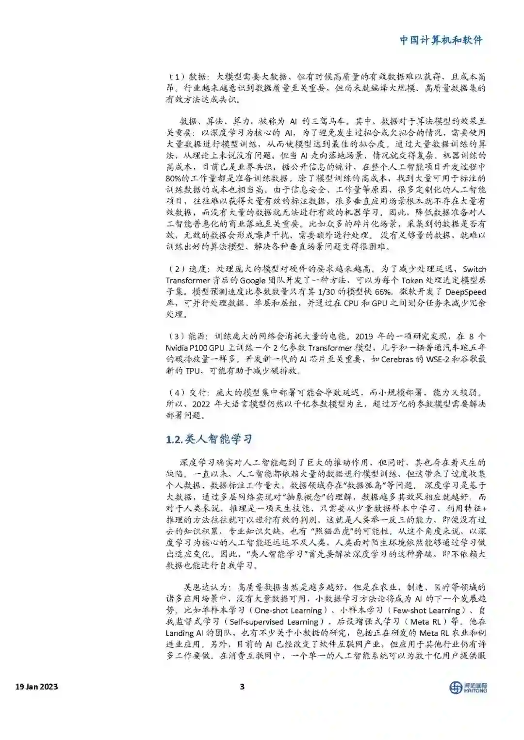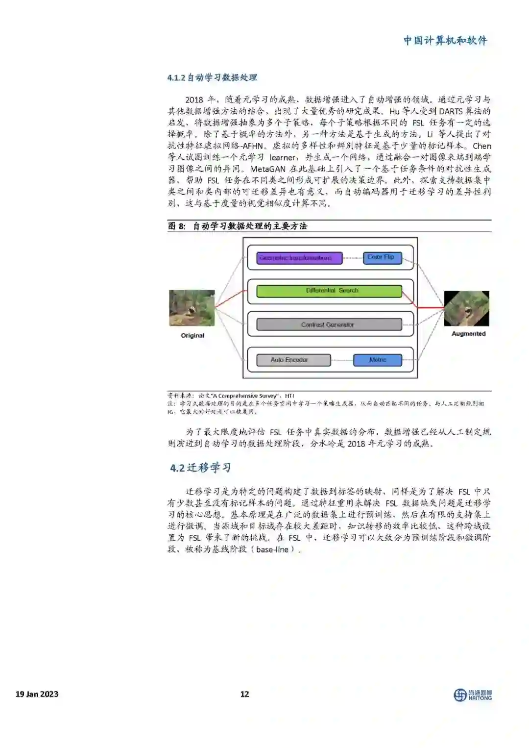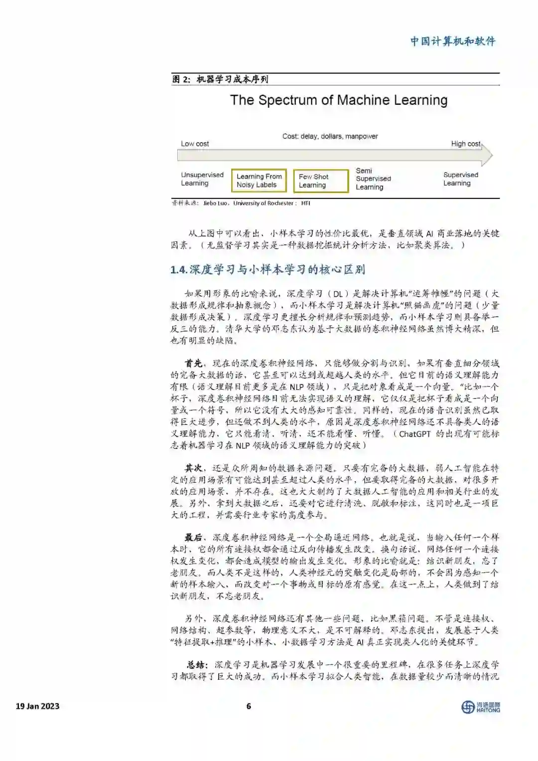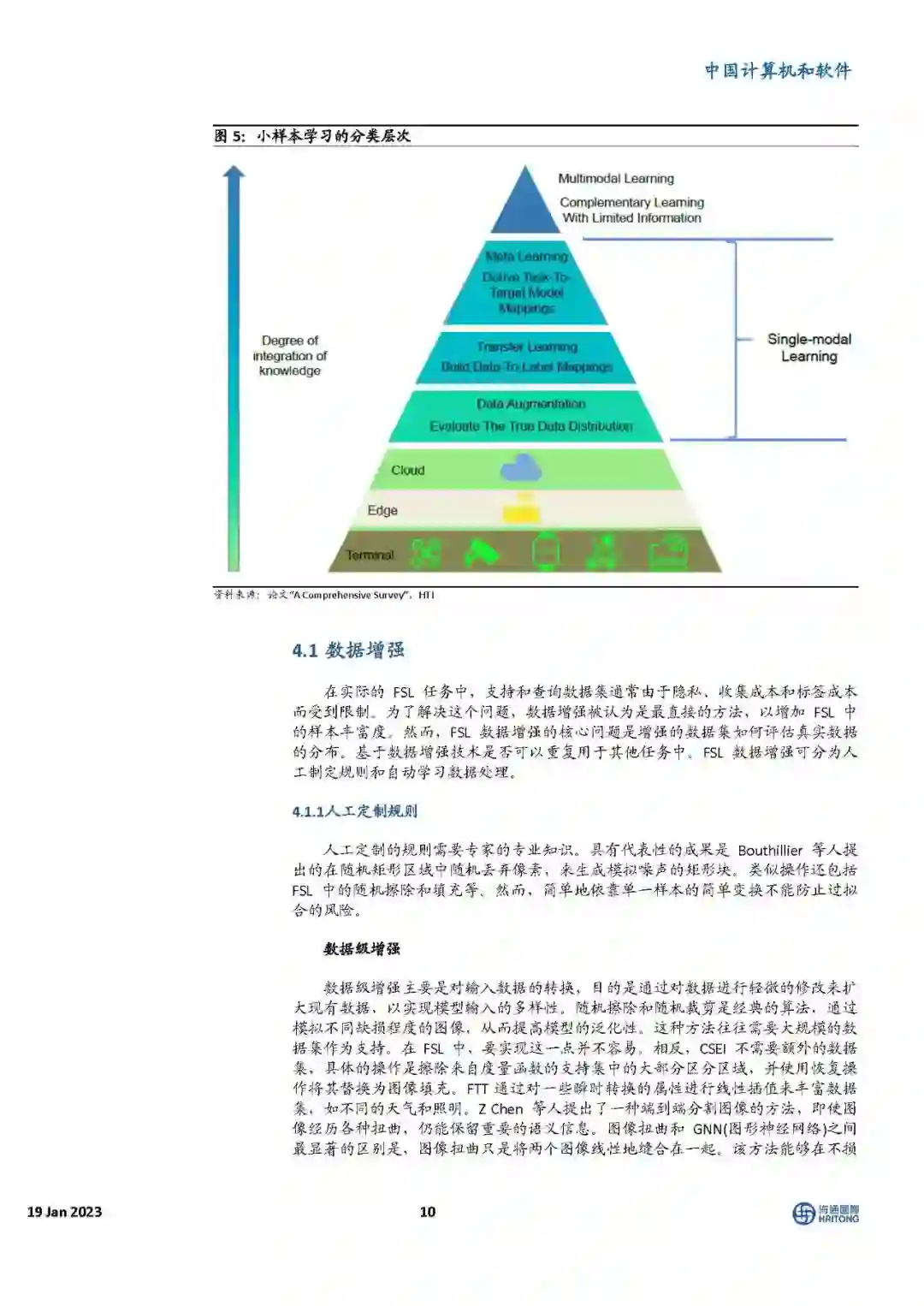 类人智能的小样本学习。如果用形象的比喻来说,深度学习(DL)是解决计算机“运筹帷幄”的问题(大量数据形成规律和抽象概念),而小样本学习是解决计算机“照猫画虎”的问题(少量数据形成决策)。深度学习更擅长分析规律和预测趋势,而小样本学习则具备举一反三的能力。小样本学习相当符合人类的思维推理模式,是实现类人人工智能的必由之路。 小样本研究领域的发展现状。2011年至2015年,由于小样本理论不完整,相关论文较少。自2015年以来,随着深度学习的兴起,小样本学习进入深度学习阶段,相关研究论文的数量呈线性大幅增长。国家间,在小样本学习研究领域的竞争也十分激烈,美国和中国是最大的两个研究产出国,而美国的私营部门在小样本学习的投入领先于其他国家。 小样本学习可以解决AI商业落地难题。2015年是小样本学习研究进展的分水岭,开始真正进入深度学习阶段,进而带动AI产业的实质性应用落地。小样本学习算法的性价比最优,不需要大量数据的标注准备,极大降低了数据标注、算力以及AI交付的工程化成本,对AI应用普惠化起到了至关重要的作用。 工业视觉检测是小样本学习的典型应用场景。小样本学习相关的任务中,计算机视觉是最活跃的研究领域,而AI视觉检测是小样本学习在工业领域的突出应用。