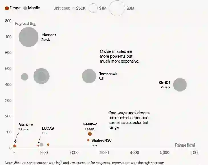 图:更廉价的无人机正在改变现代战争 选定导弹和无人机的估计成本、有效载荷和航程对比图