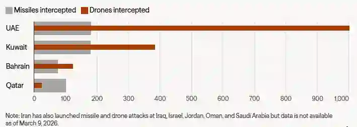 图:早期迹象表明伊朗大规模使用无人机截至3月5日伊朗发射的被拦截导弹和无人机数量统计图