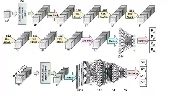图2.详细网络架构第一阶段网络中五个分类器的详细架构如图1c所示。对于一个大小为113 Å3的输入体素,应用一个卷积块,它由一个包含64个大小为33 Å3的过滤器的卷积层、一个3D批处理归一化层 (批大小设置为256)和一个ReLU激活(生成64个63 Å3的体素)组成。然后,体素被传递到maxpooling层,大小为23 Å3。之后,每个体素连接到6个3D残块,使用大小为33 Å3的128,256,256,512,512和1024过滤器。在最后一步,应用一个大小为23 Å3的平均池化层,得到一个1024值的特征向量,该特征向量连接到一个完全连接的层,以给出最终的概率值。第二阶段网络包含73个相邻体素的概率值。使用卷积块处理输入,卷积块由一个具有32个大小为2的过滤器的3D卷积层、一个3D批处理归一化层和一个ReLU激活层(批处理大小为256)组成,然后是一个完全连接的网络。卷积层的步幅为1。最后,对四种结构类型的输出概率值进行softmax运算。对模拟地图数据进行网络训练,用于模拟地图,对实验地图进行网络训练。 4.** 实验结果**本文研究了Emap2sec+在108个非冗余模拟地图(分别位于6和10 Å)以及一组84个实验地图上的性能。使用独立的训练集分别训练模拟和实验地图的神经网络。