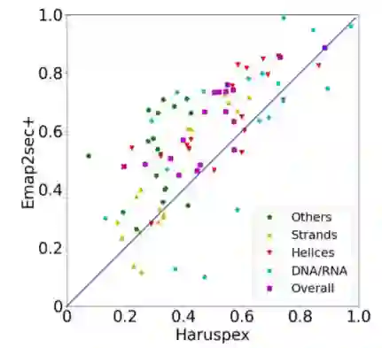 图5.与相关工作的比较在本文的工作之前,用于检测DNA/RNA和蛋白质结构的方法非常有限。流行的结构建模工具最初是为x射线晶体学开发的,ARP/wARP (v8.0)8、Phenix7和Brickworx26,只适用于仅包含蛋白质或DNA/RNA的地图。这项工作的前身Emap2sec仅用于蛋白质二级结构检测。如前所述,Emap2sec+在蛋白质结构分配上的表现优于Emap2sec。最近的一项工作haruspex是最接近Emap2sec+的,因为它使用了深度神经网络来检测DNA/RNA和蛋白质结构。然而,它们的工具和目标应用的目的是完全不同的;Haruspex的设计目的是在4 Å的高分辨率地图中检测结构,或更好地检测从低温- EM构建的结构模型中的潜在错误,或协助建模过程,而Emap2sec+是为6-10 Å的地图提供结构线索,否则结构信息是不容易检测到的。 当考虑所有19张地图的F1总分平均值时,Emap2sec+的值为0.620,高于Haruspex的0.488。有一张地图上Haruspex的F1总分更高。在单个结构类水平上,Emap2sec+对α螺旋、β链、其他结构和DNA/RNA的平均F1分分别比Haruspex高0.105、0.066、0.197和0.043。这两种方法在DNA/RNA类的表现最接近,其中Haruspex在19个地图中的8个显示了更高的F1分。由于这两种方法具有不同的设计和目的,本文的比较只是为了说明它们在本质上的不同,并了解Emap2sec+的性能。Emap2sec+在α螺旋、β链、其他结构和DNA/RNA图谱上分别表现出较高的F1分。 5. 总结本文汇报了Emap2sec+,这是一种基于深度学习的方法,可以在中等分辨率下检测EM map中的结构(5-10 Å),它通过实现核酸检测和提高蛋白质二级结构检测精度,大幅升级了之前的Emap2sec。核苷酸的检测效果特别好,即使在分辨率较低的地图上,准确性也没有下降多少。这项工作首次探索了蛋白质-核酸复合体在这一困难分辨率范围内的结构信息。同样的深度学习策略将被用于检测EM图中的其他分子或结构,如氨基酸类型。Emap2sec+将帮助结构分配和建模,实现快速和准确的预测,将是低温电磁结构生物学时代一个有用和强大的工具。