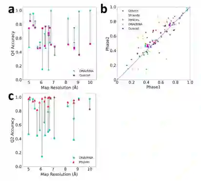 图****4.****实验图实验结果19张实验图的结构类检测: a.实验地图相对于地图分辨率的Q4精度。整体Q4用洋红色的方块表示,DNA/RNA的Q4用青色的圆圈表示。线连接同一地图映射的值。B.第一阶段和第二阶段网络基于残差的精度比较。c.Q2区分实验图谱中蛋白质和DNA/RNA类的二元分类精度。注意,DNA/RNA的值可能与报告四类分类结果的面板a不同。由于蛋白质类别的概率计算为三个二级结构类别的概率之和,因此四类分类中的DNA/RNA分配可以更改为二类分类中的蛋白质。