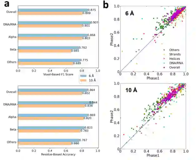 图****3.****模拟图实验结果模拟地图数据集上的结构检测性能。该数据集包含108个以两种不同分辨率计算的结构,6Å和10Å。a:6Å(蓝色)和10Å(橙色)地图的基于体素的F1评分和基于Q4残基/核苷酸的准确性b:在6 Å和10 Å计算的108个测试模拟地图的第1和第2阶段网络输出的第4季度的比较。绿色,其他结构;黄色三角形,β链;红色三角形,α螺旋;青色,DNA / RNA;品红色,Q4评分比较基于体素的准确性和Q4, Q4在所有结构类中都更高。考虑到基于残基/核苷酸的分配是通过体素的多数票进行的,这表明相邻体素的分配趋于一致,这有利于用户在密度图中直观地识别蛋白质和DNA/RNA结构。此外,本文注意到α螺旋和β链的基于段的准确性非常高,分别为0.950和0.940的6Å图。这些结果强烈表明,Emap2sec+的结构分配将能够帮助cryoEM图的主链跟踪和域结构分配。10Å地图的结果比6Å地图的结果差6 - 13%。在四个结构类中,α螺旋的差异最小,在6Å和10Å地图之间,基于体素的F1评分差距为7.5%,Q4为5.6%。尽管有所下降,但值得注意的是,基于体素的F1总分和10 Å的Q4总分维持在0.8的高位。因此,本文可以得出结论,即使是10Å分辨率的模拟地图,也含有丰富的结构信息。