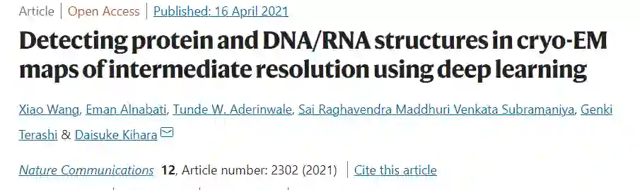 本文介绍的是由普渡大学西拉法叶校区计算机科学系的Xiao Wang, Eman Alnabati, Tunde W. Aderinwale等人发表在Nature Communications上的文章《Detecting protein and DNA/RNA structures in cryo-EM maps of intermediate resolution using deep learning》。越来越多的大分子结构的密度图,包括蛋白质和DNA/RNA复合体,已经通过低温电子显微镜确定。尽管最近在接近原子分辨率的地图经常被报道,仍然有大量的地图确定在中等或低分辨率,提取结构信息不是小事。在这里,本文报道了一种新的计算方法,Emap2sec+,它可以在5到10 Å分辨率的低温电镜图中识别DNA或RNA以及蛋白质的二级结构。Emap2sec+采用深度残差卷积神经网络。Emap2sec+在低温-电磁图的每一个体素上分配具有关联概率的结构标签,这将有助于在电磁图中建模结构。 1.摘要近年来,利用低温电子显微镜(cryo-EM)测定生物分子结构取得了迅速进展。存放在公共数据库EMDB中的确定的低温EM图的数量正在呈指数级增长;此外,其中高分辨率(如优于4 Å)地图的比例呈稳步上升趋势。尽管低温电磁技术取得了显著的进展,但仍有相当一部分地图是用中分辨率或低分辨率确定的。不同的因素控制着EM图的分辨率,包括EM样品的构象或成分的不均匀性、低电子剂量引入的噪声水平以及二维粒子图像的不准确对齐。在此之前,本文开发了一种名为Emap2sec的方法,用于检测中间分辨率EM图中的蛋白质二级结构元素。Emap2sec显示了良好的结果,为中分辨率的地图结构解释提供了一种新的方法。然而,Emap2sec的检测仅限于蛋白质图谱。在这里,本文扩展了该方法,以检测蛋白质二级结构元素和中分辨率的EM图的核酸。新方法Emap2sec+使用了比它的前任Emap2sec更先进的卷积神经网络架构Resnet,并对EM图中的每个体素执行四类分类:α-螺旋、β-链、线圈(其他结构类型)或DNA/RNA。蛋白质与核酸的相互作用是许多基本生物过程的核心,包括转录、翻译、细胞分裂和复制。尽管研究蛋白质-核酸相互作用的结构很重要,但用于DNA/RNA结构建模的工具并不多。Emap2sec+具有较高的核苷酸检测精度,同时保持了与Emap2sec相当的蛋白质二级结构检测性能。 2.数据集本文在两个数据集上测试了Emap2sec+,一个是分辨率为6 Å和10 Å的108个蛋白质和核酸复杂结构的模拟EM图数据集,另一个是分辨率为5 Å和10 Å的84个实验EM图数据集。 3**.**** Emap2sec+架构**
