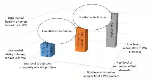 手动WG(MWG)没有任何计算机手段参与执行WG。人工环形模拟代表了人工WG,其中作战环境、行动方案和效果都是由人类完全控制的。MWG分析代表复杂系统的非结构化问题,对人类行为的保真度很高,因为它不取代任何WG的人类元素。完全自动化的WG(FAWG)有所有的WG人类角色,如裁判员、球员和分析员完全自动化。带有自动分析员的闭环模拟表示FAWG。FAWG中没有人类干预,就作者所知,目前还没有这样的解决方案。如果使用最先进的人工智能技术来实现FAWG,它对人类行为的保真度会很低。计算机辅助WG(CAWG)将特定的WG人类行为元素自动化。随着CAWG中更多的人类行为元素被自动化,人类行为的保真度就会下降。