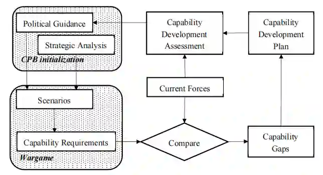 国家政治指导,与预测20年范围内的政治和军事气候的战略分析同时进行,启动了国家方案编制过程,并在战略层面形成了描述未来作战环境的情景。选定的场景为兵棋推演提供了刺激,产生了涵盖所有潜在威胁和国家政治野心的能力要求。在现有力量和所需能力之间进行比较,产生能力差距。能力发展计划包含每个能力发展的里程碑,推动所有中长期军事投资。能力发展评估通过反映能力发展中必要变化的最新政治指导,向中央政治局提供反馈。